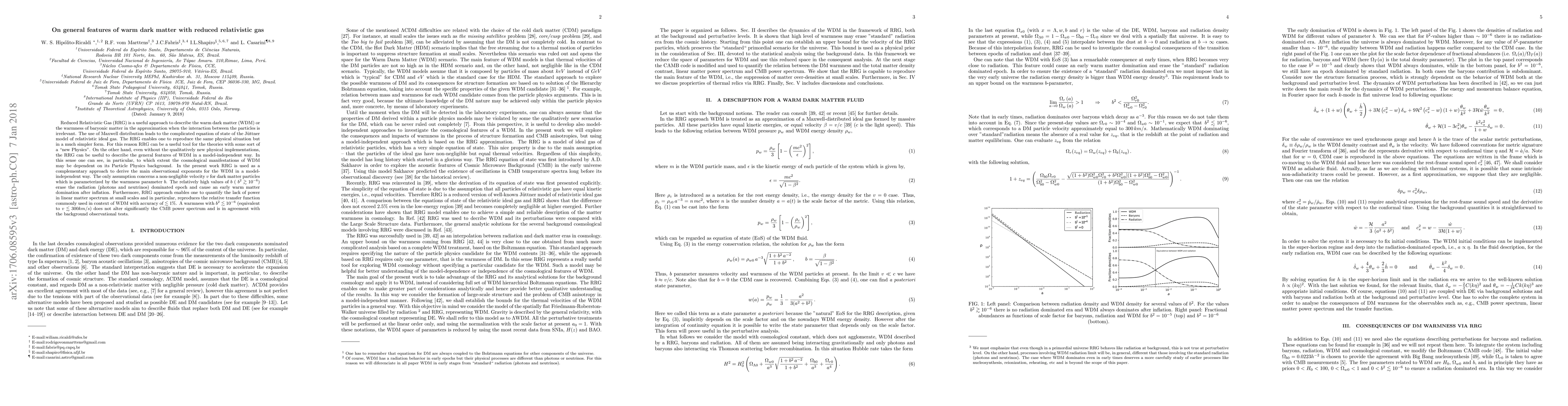 Reduced Relativistic Gas (RRG) is a useful approach to describe the warm dark matter (WDM) or the warmness of baryonic matter in the approximation when the interaction between the particles is irrelevant. The use of Maxwell distribution leads to the complicated equation of state of the J\"{u}ttner model of relativistic ideal gas. The RRG enables one to reproduce the same physical situation but in a much simpler form. For this reason RRG can be a useful tool for the theories with some sort of a "new Physics". On the other hand, even without the qualitatively new physical implementations, the RRG can be useful to describe the general features of WDM in a model-independent way. In this sense one can see, in particular, to which extent the cosmological manifestations of WDM may be dependent on its Particle Physics background. In the present work RRG is used as a complementary approach to derive the main observational exponents for the WDM in a model-independent way. The only assumption concerns a non-negligible velocity $v$ for dark matter particles which is parameterized by the warmness parameter $b$. The relatively high values of $b$ ( $b^2\gtrsim 10^{-6}$) erase the radiation (photons and neutrinos) dominated epoch and cause an early warm matter domination after inflation. Furthermore, RRG approach enables one to quantify the lack of power in linear matter spectrum at small scales and in particular, reproduces the relative transfer function commonly used in context of WDM with accuracy of $\lesssim 1\%$. A warmness with $b^2\lesssim 10^{-6}$ (equivalent to $v\lesssim 300 km/s$) does not alter significantly the CMB power spectrum and is in agreement with the background observational tests.
