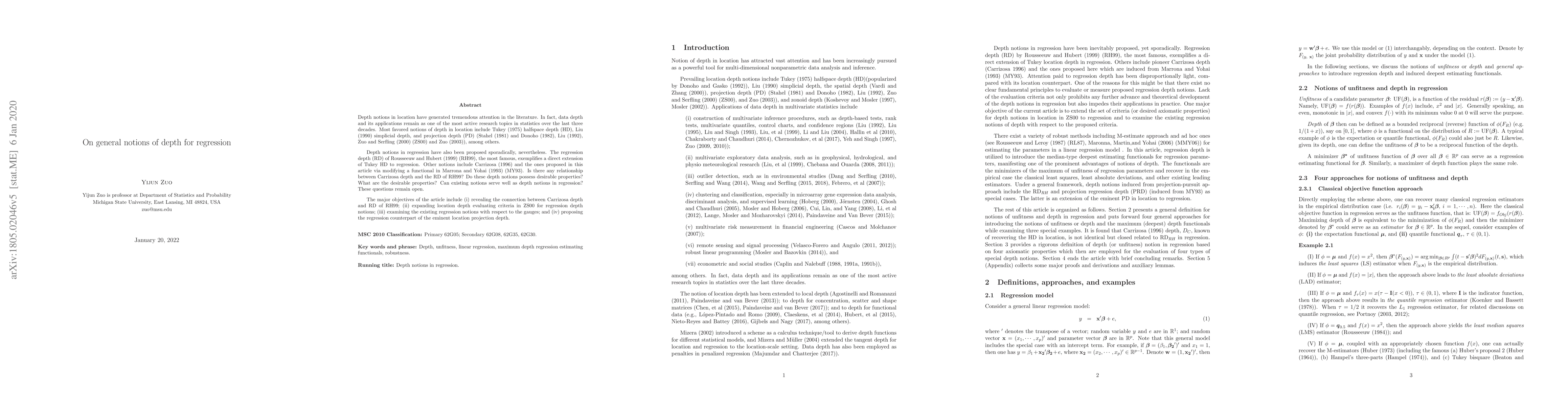 Depth notions in location have fascinated tremendous attention in the literature. In fact data depth and its applications remain one of the most active research topics in statistics in the last two decades. Most favored notions of depth in location include Tukey (1975) halfspace depth (HD), Liu (1990) simplicial depth, and projection depth (Stahel (1981) and Donoho (1982), Liu (1992), Zuo and Serfling (2000) (ZS00) and Zuo (2003)), among others. Depth notions in regression have also been proposed, sporadically nevertheless. Regression depth (RD) of Rousseeuw and Hubert (1999) (RH99) is the most famous one which is a direct extension of Tukey HD to regression. Others include Carrizosa (1996) and the ones induced from Marrona and Yohai (1993) (MY93) proposed in this article. Is there any relationship between Carrizosa depth and RD of RH99? Do these depth notions possess desirable properties? What are the desirable properties? Can existing notions really serve as depth functions in regression? These questions remain open. Revealing the equivalence between Carrizosa depth and RD of RH99; expanding location depth evaluating criteria in ZS00 for regression depth notions; examining the existing regression notions with respect to the gauges; and proposing the regression counterpart of the eminent projection depth in location are the four major objectives of the article.