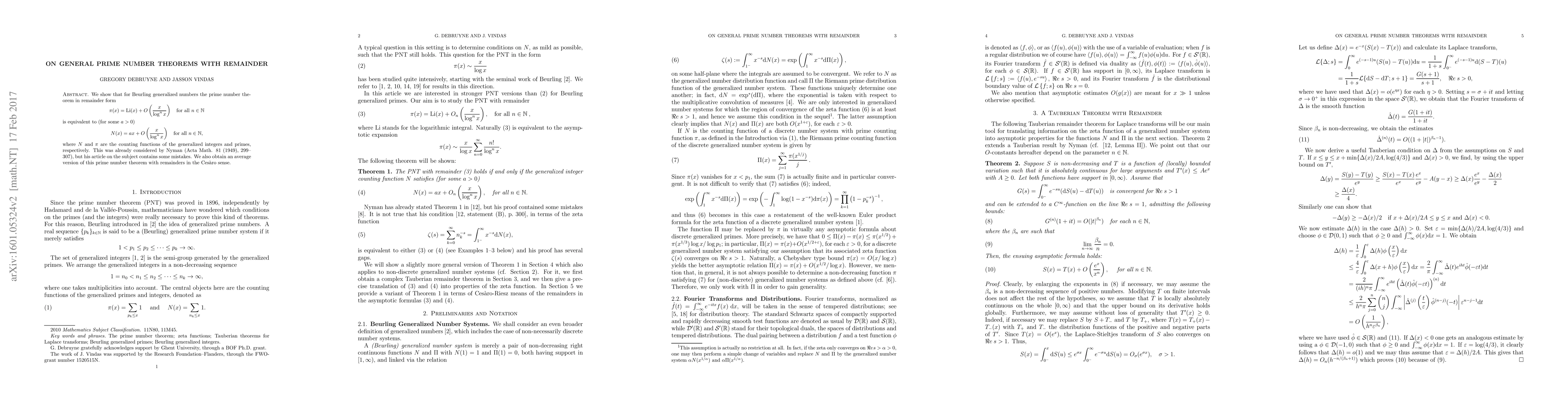 We show that for Beurling generalized numbers the prime number theorem in remainder form $$\pi(x) = \operatorname*{Li}(x) + O\left(\frac{x}{\log^{n}x}\right) \quad \mbox{for all } n\in\mathbb{N}$$ is equivalent to (for some $a>0$) $$N(x) = ax + O\left(\frac{x}{\log^{n}x}\right) \quad \mbox{for all } n \in \mathbb{N},$$ where $N$ and $\pi$ are the counting functions of the generalized integers and primes, respectively. This was already considered by Nyman (Acta Math. 81 (1949), 299-307), but his article on the subject contains some mistakes. We also obtain an average version of this prime number theorem with remainders in the Ces\`aro sense.