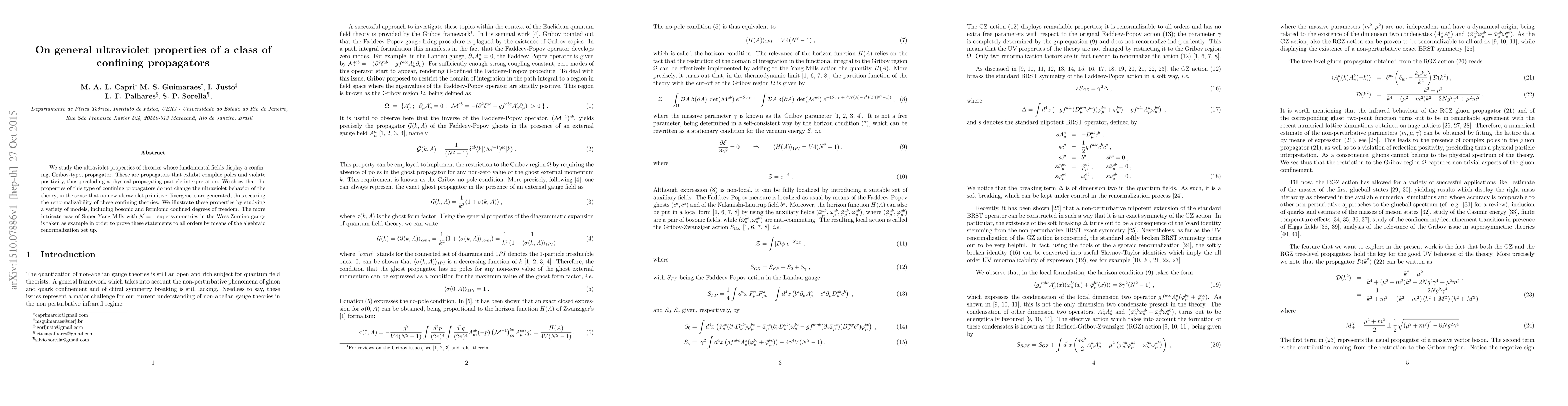 We study the ultraviolet properties of theories whose fundamental fields display a confining, Gribov-type, propagator. These are propagators that exhibit complex poles and violate positivity, thus precluding a physical propagating particle interpretation. We show that the properties of this type of confining propagators do not change the ultraviolet behavior of the theory, in the sense that no new ultraviolet primitive divergences are generated, thus securing the renormalizability of these confining theories. We illustrate these properties by studying a variety of models, including bosonic and fermionic confined degrees of freedom. The more intricate case of Super Yang-Mills with ${\cal N} =1$ supersymmetries in the Wess-Zumino gauge is taken as example in order to prove these statements to all orders by means of the algebraic renormalization set up.