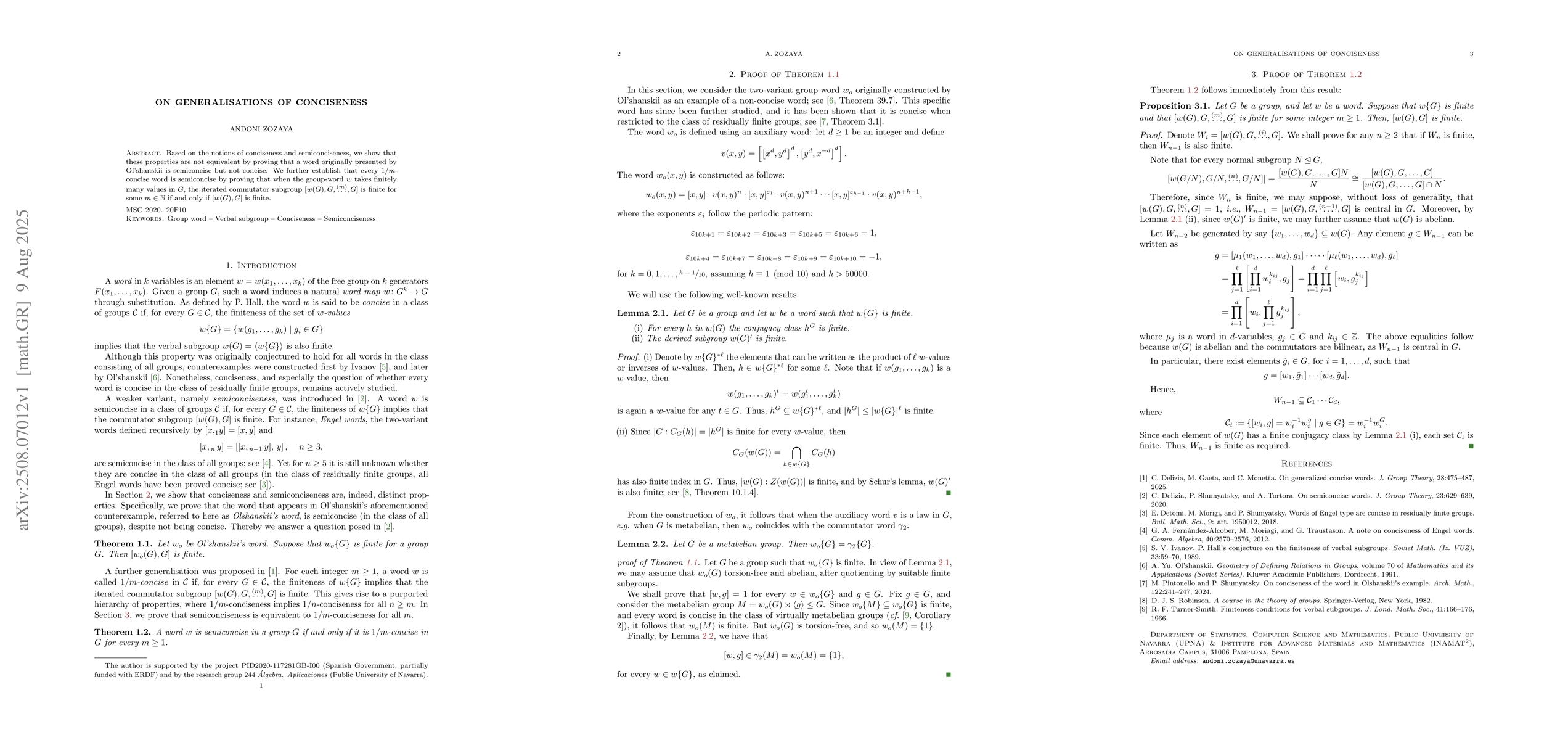 Based on the notions of conciseness and semiconciseness, we show that these properties are not equivalent by proving that a word originally presented by Ol'shanskii is semiconcise but not concise. We further establish that every $1/m$-concise word is semiconcise by proving that when the group word $w$ takes finitely many values in $G$, the iterated commutator subgroup $[w(G), G, \stackrel{(m)}{\dots}, G]$ is finite for some $m \in \mathbb{N}$ if and only if $[w(G), G]$ is finite.