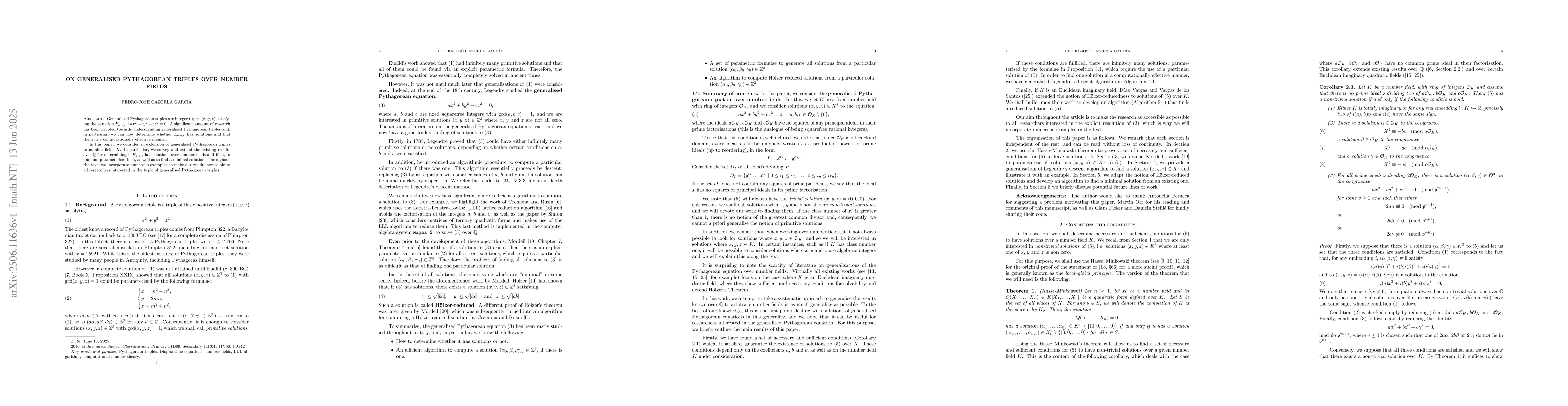 Generalised Pythagorean triples are integer tuples $(x,y,z)$ satisfying the equation $E_{a,b,c}: ax^2+by^2+cz^2=0$. A significant amount of research has been devoted towards understanding generalised Pythagorean triples and, in particular, we can now determine whether $E_{a,b,c}$ has solutions and find them in a computationally effective manner. In this paper, we consider an extension of generalised Pythagorean triples to number fields $K$. In particular, we survey and extend the existing results over $\mathbb{Q}$ for determining if $E_{a,b,c}$ has solutions over number fields and if so, to find and parameterise them, as well as to find a minimal solution. Throughout the text, we incorporate numerous examples to make our results accessible to all researchers interested in the topic of generalised Pythagorean triples.