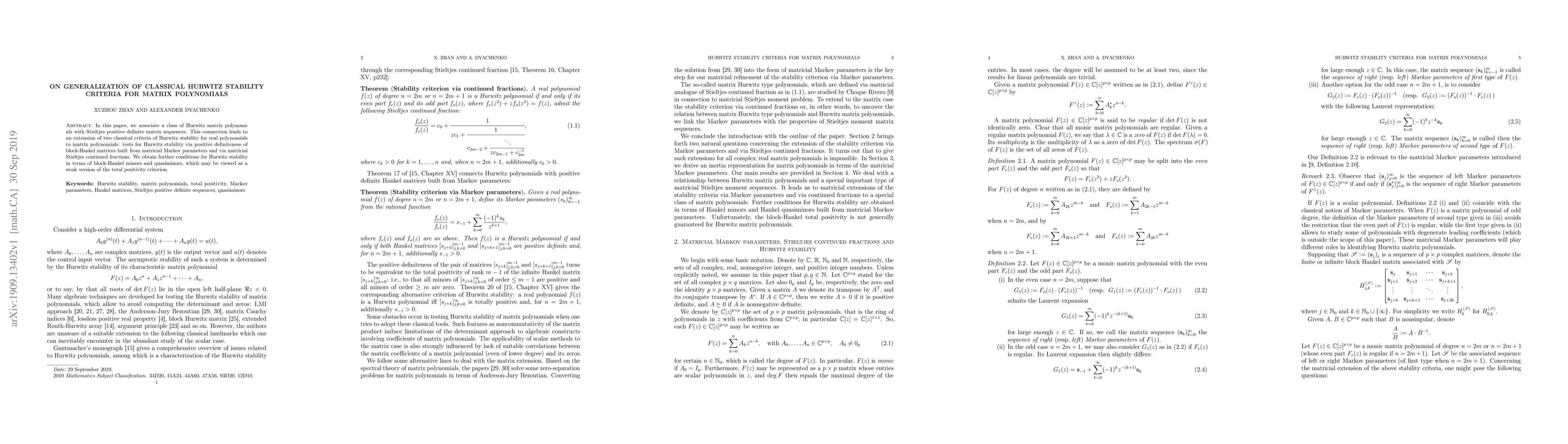 This paper extends classical Hurwitz stability criteria for real polynomials to matrix polynomials by linking Hurwitz matrix polynomials with Stieltjes positive definite sequences. It introduces new tests for Hurwitz stability using block-Hankel matrices and matricial Stieltjes continued fractions.