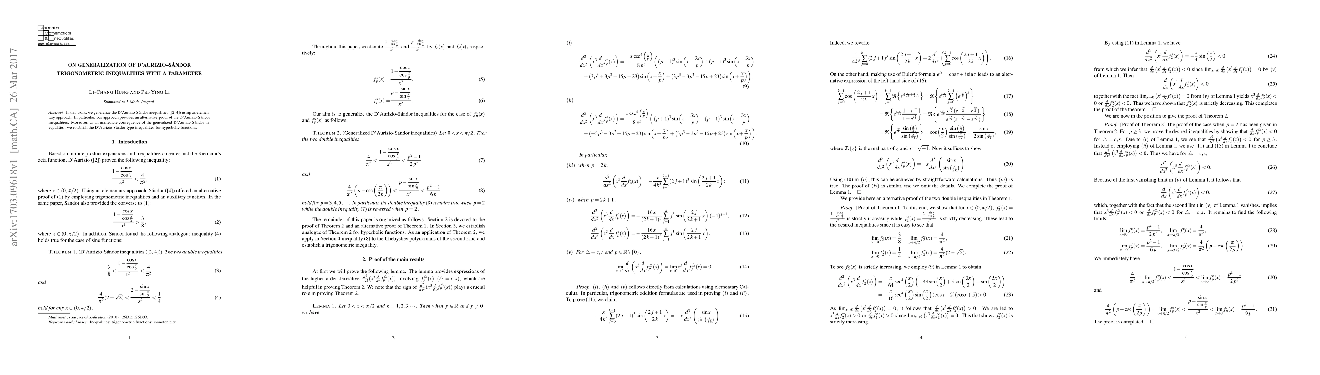 In this work, we generalize the D'Aurizio-S\'andor inequalities (\cite{D'Aurizio,Sandor}) using an elementary approach. In particular, our approach provides an alternative proof of the D'Aurizio-S\'andor inequalities. Moreover, as an immediate consequence of the generalized D'Aurizio-S\'andor inequalities, we establish the D'Aurizio-S\'andor-type inequalities for hyperbolic functions.