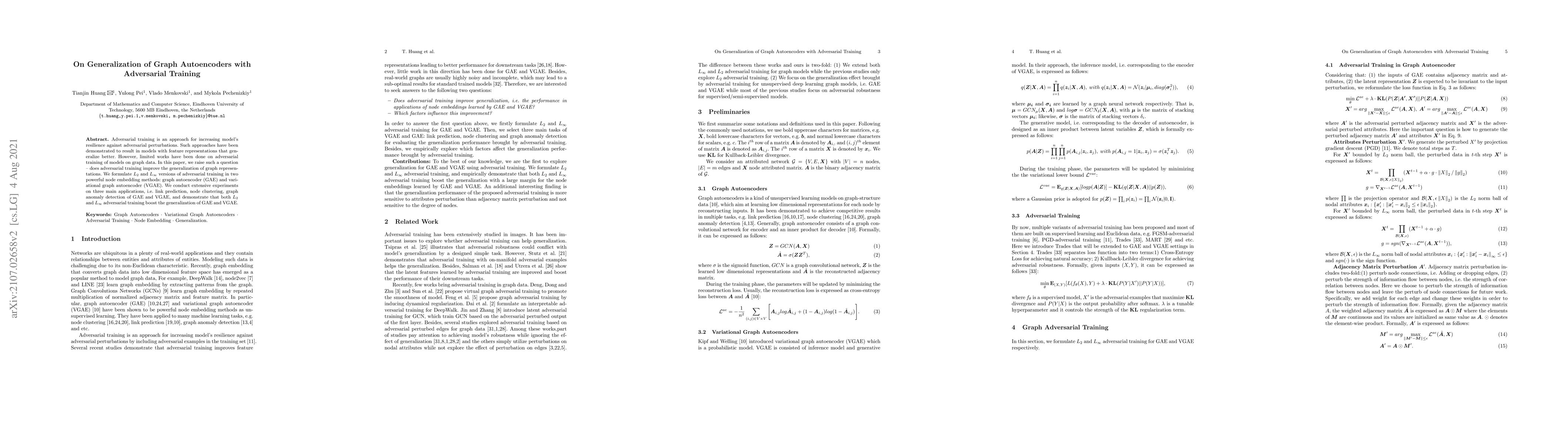 The paper formulates L2 and L1 versions of adversarial training for Graph Autoencoders (GAE) and Variational Graph Autoencoders (VGAE), applying it to link prediction, node clustering, and graph anomaly detection tasks.