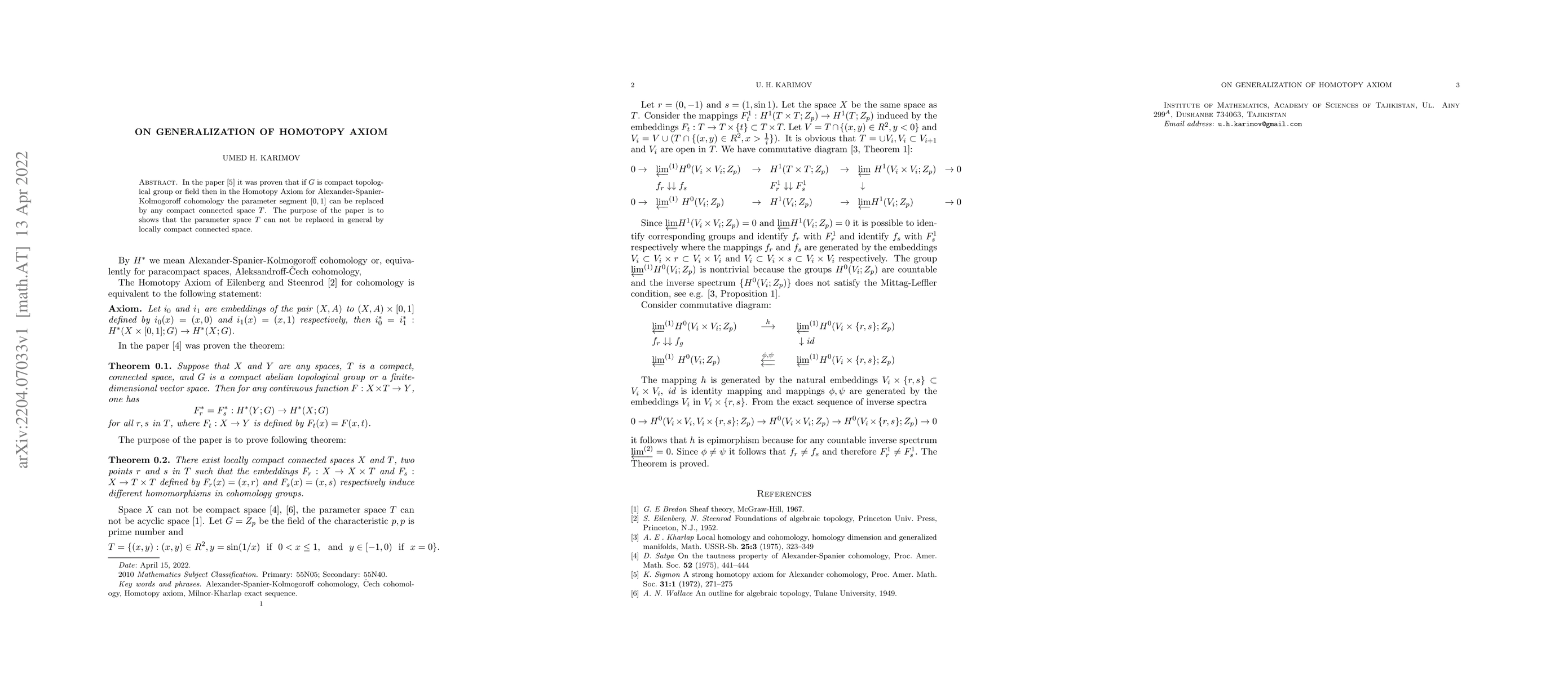 This paper generalizes the Homotopy Axiom for Alexander-Spanier-Kolmogorov cohomology, showing that while $[0, 1]$ can be replaced by any compact connected space $T$ for compact groups or fields, $T$ cannot generally be replaced by a locally compact connected space.