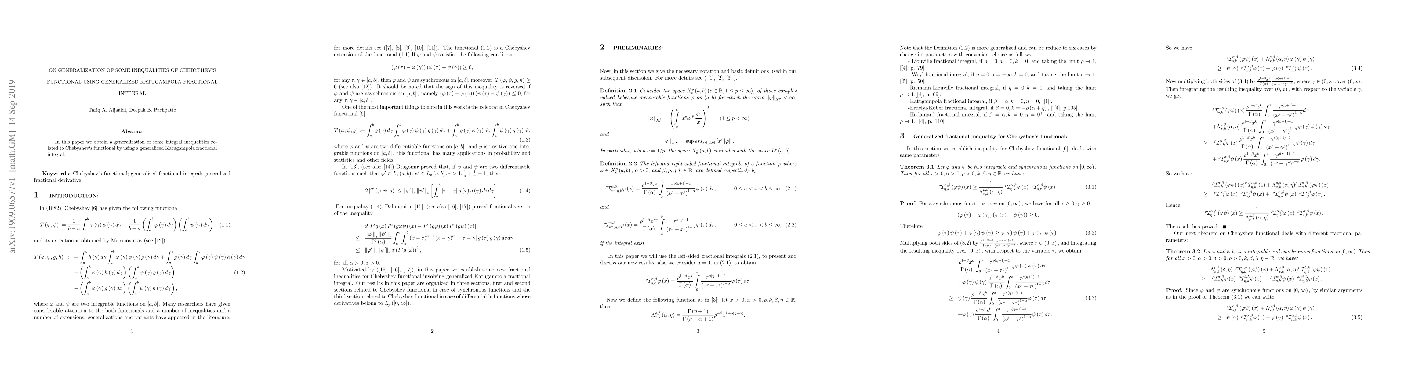 This paper generalizes several integral inequalities associated with Chebyshev's functional through the application of a generalized Katugampola fractional integral. The results extend the applicability of these inequalities in fractional calculus.