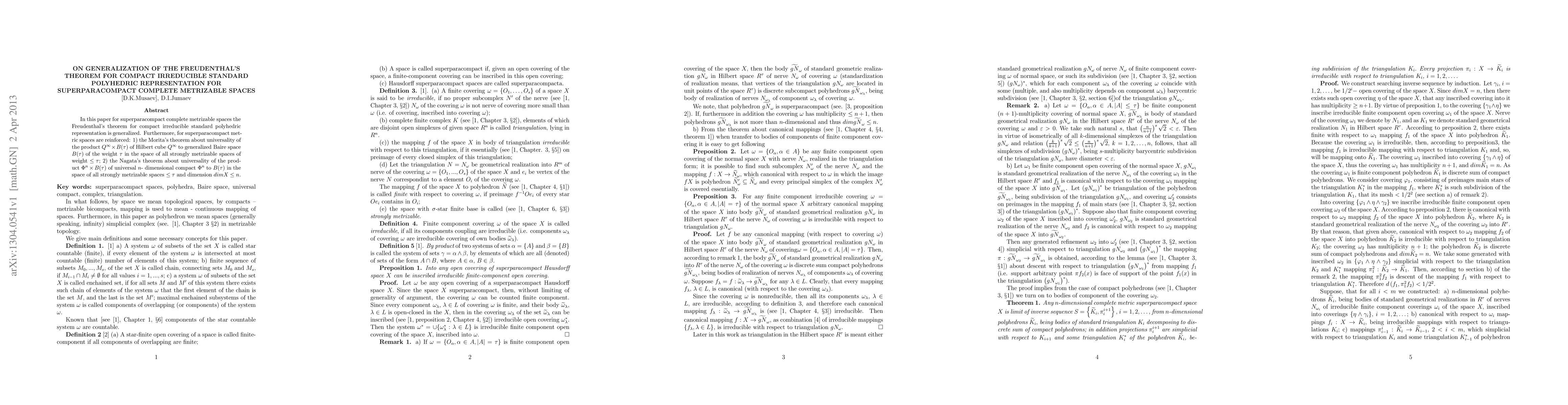 In this paper for superparacompact complete metrizable spaces the Freudenthal's theorem for compact irreducible standard polyhedric representation is generalized. Furthermore, for superparacompact metric spaces are reinforced: 1) the Morita's theorem about universality of the product $Q^\infty\times B(\tau)$ of Hilbert cube $Q^\infty$ to generalized Baire space $B(\tau)$ of the weight $\tau$ in the space of all strongly metrizable spaces of weight $\le \tau$; 2) the Nagata's theorem about universality of the product $\Phi^n\times B(\tau)$ of universal $n$- dimensional compact $\Phi^n$ to $B(\tau)$ in the space of all strongly metrizable spaces $\le\tau$ and dimension $dimX\le n.$