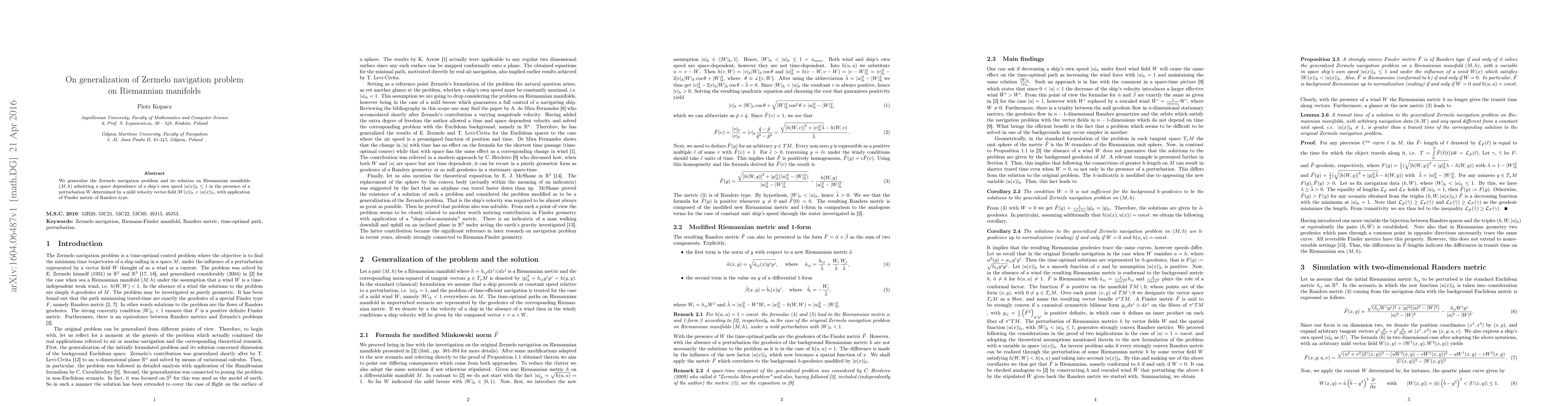 This paper generalizes the Zermelo navigation problem to Riemannian manifolds, incorporating a speed constraint and a perturbation, and utilizes a Randers type Finsler metric for the solution. The approach extends classical navigation theory to more complex, curved spaces.