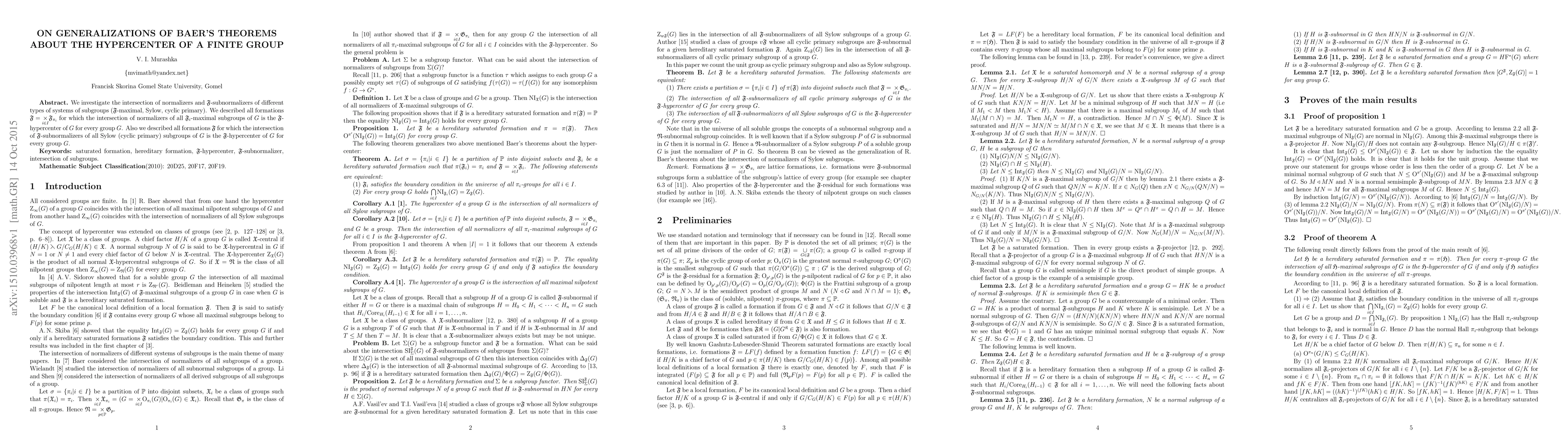 We investigate the intersection of normalizers and $\mathfrak{F}$-subnormalizers of different types of systems of subgroups ($\mathfrak{F}$-maximal, Sylow, cyclic primary). We described all formations $\mathfrak{F}=\underset{i\in I}\times\mathfrak{F}_{\pi_i}$ for which the intersection of normalizers of all $\mathfrak{F}_i$-maximal subgroups of $G$ is the $\mathfrak{F}$-hypercenter of $G$ for every group $G$. Also we described all formations $\mathfrak{F}$ for which the intersection of $\mathfrak{F}$-subnormalizers of all Sylow (cyclic primary) subgroups of $G$ is the $\mathfrak{F}$-hypercenter of $G$ for every group $G$.