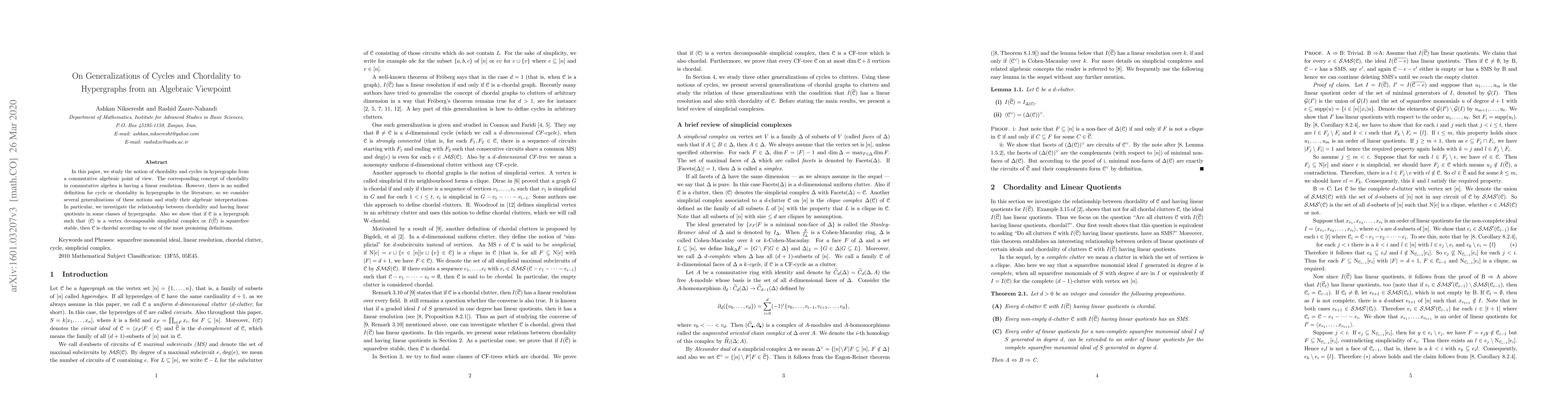 Researchers study chordality and cycles in hypergraphs from an algebraic perspective, exploring generalizations of these concepts and their relationships to linear quotients and decomposability.