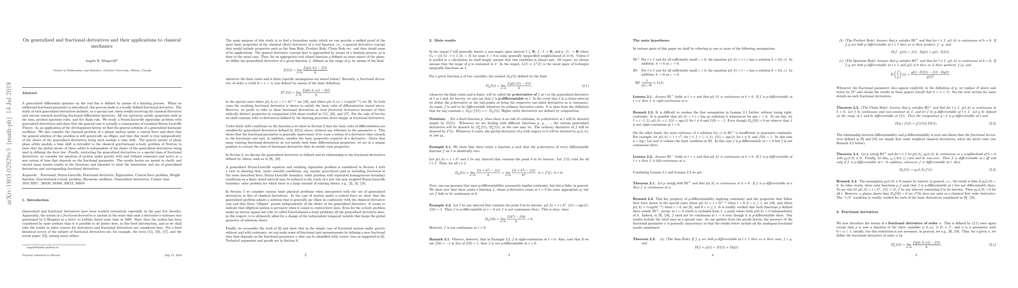 (Draft 3) A generalized differential operator on the real line is defined by means of a limiting process. These generalized derivatives include, as a special case, the classical derivative and current studies of fractional differential operators. All such operators satisfy properties such as the sum, product/quotient rules, chain rule, etc. We study a Sturm-Liouville eigenvalue problem with generalized derivatives and show that the general case is actually a consequence of standard Sturm-Liouville Theory. As an application of the developments herein we find the general solution of a generalized harmonic oscillator. We also consider the classical problem of a planar motion under a central force and show that the general solution of this problem is still generically an ellipse, and that this result is true independently of the choice of the generalized derivatives being used modulo a time shift. The previous result on the generic nature of phase plane orbits is extended to the classical gravitational n-body problem of Newton to show that the global nature of these orbits is independent of the choice of the generalized derivatives being used in defining the force law (modulo a time shift). Finally, restricting the generalized derivatives to a special class of fractional derivatives, we consider the question of motion under gravity with and without resistance and arrive at a new notion of time that depends on the fractional parameter. The results herein are meant to clarify and extend many known results in the literature and intended to show the limitations and use of generalized derivatives and corresponding fractional derivatives.