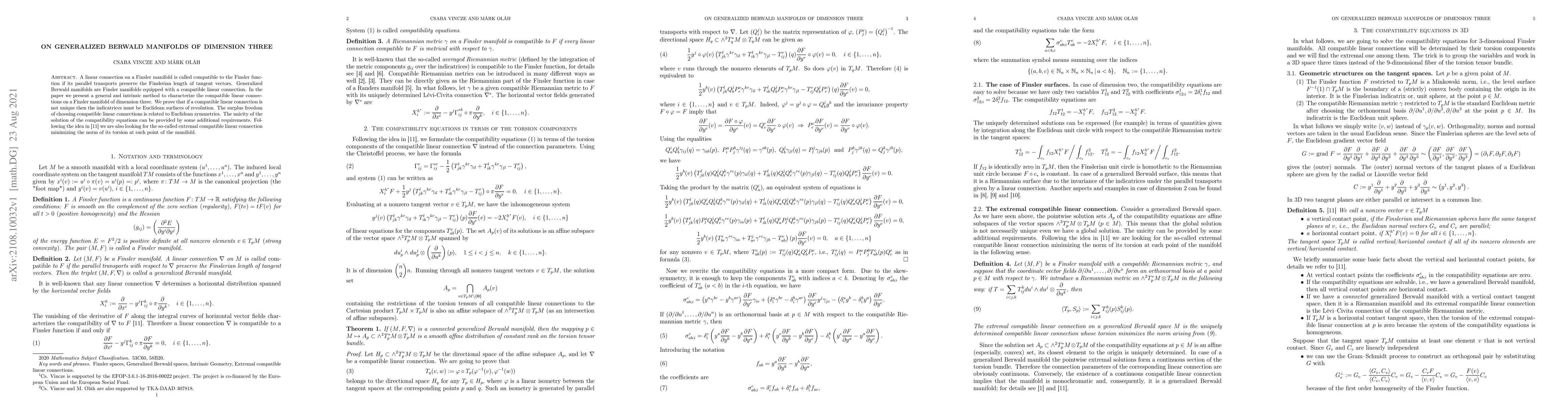 A linear connection on a Finsler manifold is called compatible to the Finsler function if its parallel transports preserve the Finslerian length of tangent vectors. Generalized Berwald manifolds are Finsler manifolds equipped with a compatible linear connection. In the paper we present a general and intrinsic method to characterize the compatible linear connections on a Finsler manifold of dimension three. We prove that if a compatible linear connection is not unique then the indicatrices must be Euclidean surfaces of revolution. The surplus freedom of choosing compatible linear connections is related to Euclidean symmetries. The unicity of the solution of the compatibility equations can be provided by some additional requirements. Following the idea in \cite{V14} we are also looking for the so-called extremal compatible linear connection minimizing the norm of its torsion at each point of the manifold.