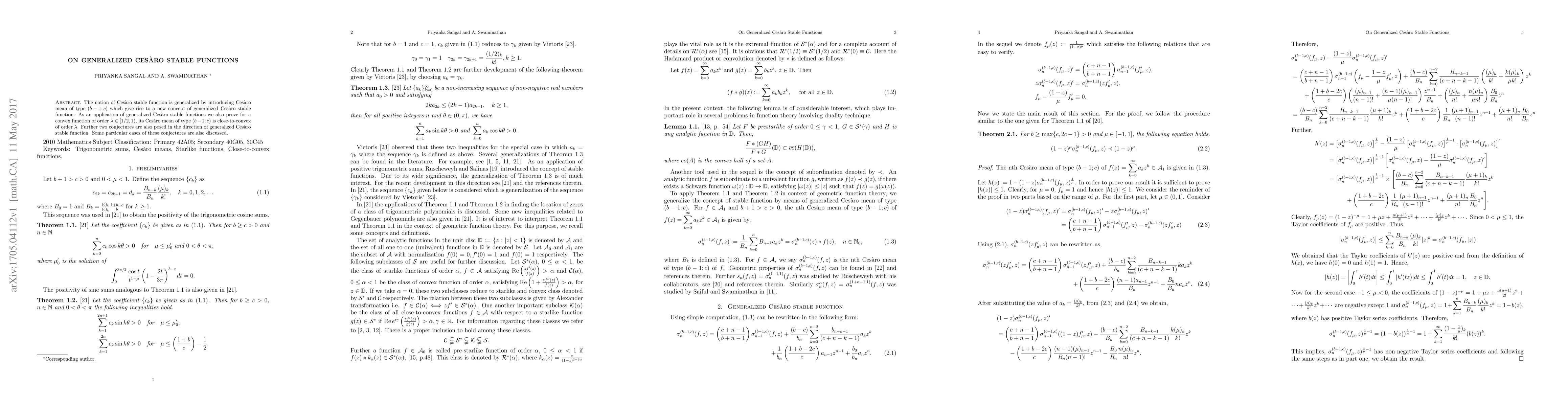 This paper generalizes the concept of Cesàro stable functions by introducing a new Cesàro mean of type $(b-1;c)$, leading to generalized Cesàro stable functions. It also proves that the Cesàro mean of type $(b-1;c)$ for convex functions of order $\lambda \in [1/2, 1)$ is close-to-convex of order $\lambda$, and presents two conjectures related to generalized Cesàro stable functions.