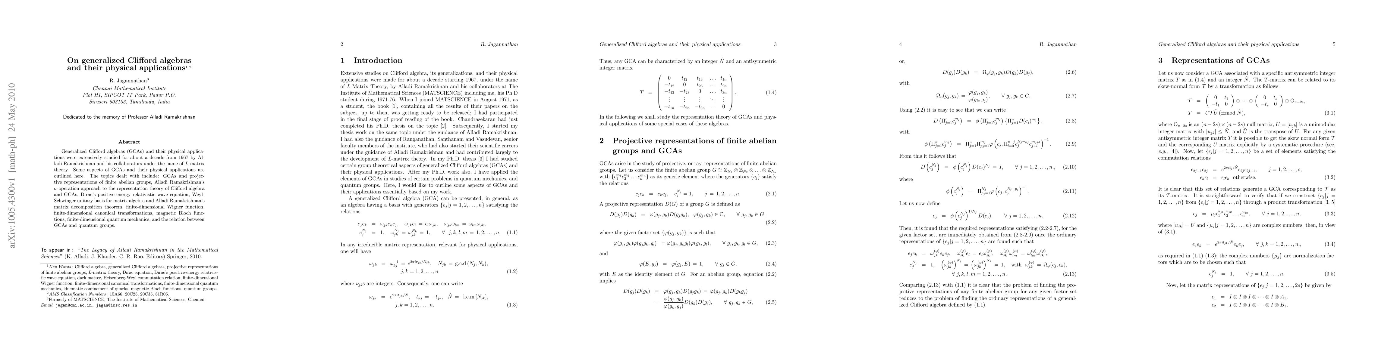 Generalized Clifford algebras (GCAs) and their physical applications were extensively studied for about a decade from 1967 by Alladi Ramakrishnan and his collaborators under the name of L-matrix theory. Some aspects of GCAs and their physical applications are outlined here. The topics dealt with include: GCAs and projective representations of finite abelian groups, Alladi Ramakrishnan's sigma operation approach to the representation theory of Clifford algebra and GCAs, Dirac's positive energy relativistic wave equation, Weyl-Schwinger unitary basis for matrix algebra and Alladi Ramakrishnan's matrix decomposition theorem, finite-dimensional Wigner function, finite-dimensional canonical transformations, magnetic Bloch functions, finite-dimensional quantum mechanics, and the relation between GCAs and quantum groups.