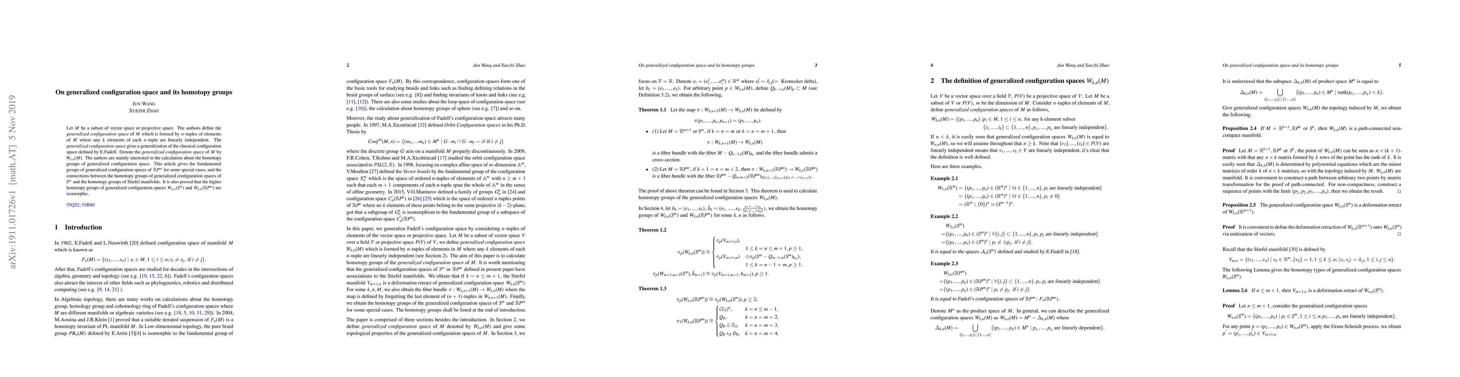 This paper generalizes the classical configuration space to $W_{k,n}(M)$, defined by $n$-tuples of linearly independent elements from $M$. The authors calculate the fundamental groups for $W_{k,n}(\mathbb{R}P^m)$ and explore connections between the homotopy groups of $W_{k,n}(S^m)$ and Stiefel manifolds, proving isomorphism of higher homotopy groups for $W_{k,n}(S^m)$ and $W_{k,n}(\mathbb{R}P^m)$.