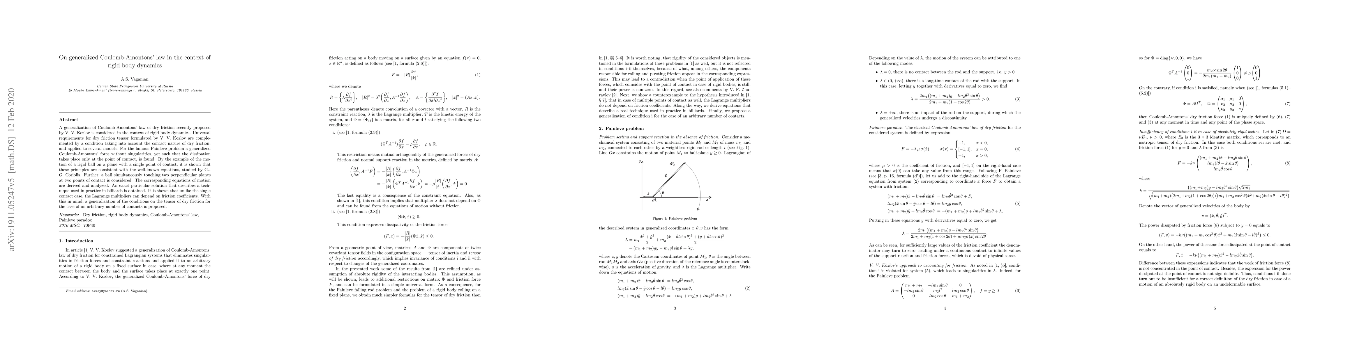 This paper generalizes Coulomb-Amontons' law for dry friction in rigid body dynamics, deriving friction tensor conditions and analyzing models with single and multiple contact points. It finds a friction force without singularities for the Painlevé problem and proposes generalized friction conditions for multiple contacts.
