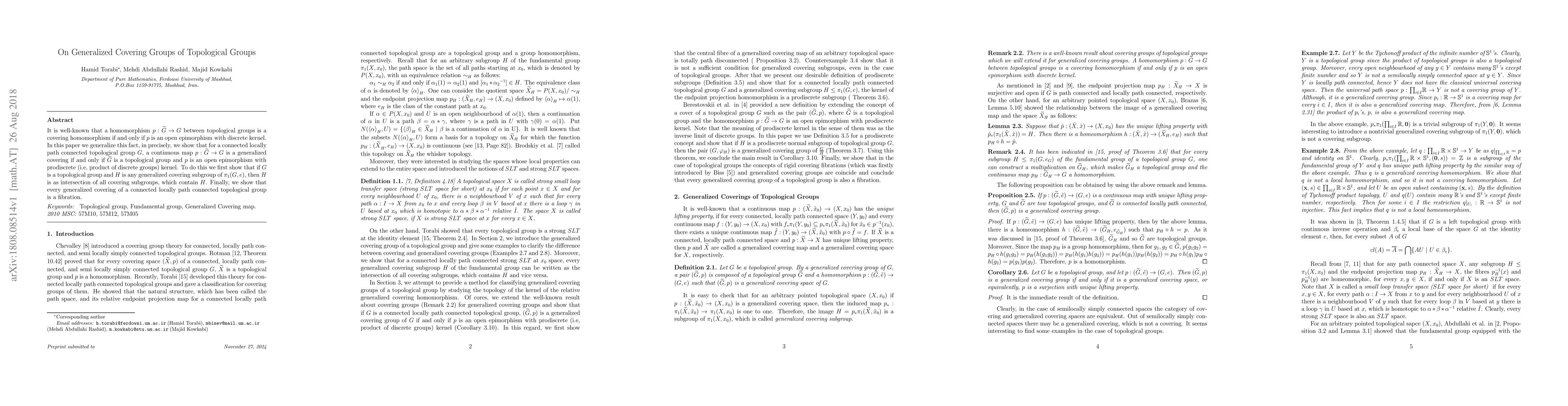 This paper generalizes the concept of covering homomorphisms in topological groups by showing that a continuous map p from a topological group K to G is a generalized covering if K is a topological group and p is an open epimorphism with a prodiscrete kernel. The authors also prove that any generalized covering subgroup of the fundamental group of G is the intersection of all covering subgroups containing it, and that every generalized covering of a connected locally path-connected group is a fibration.
