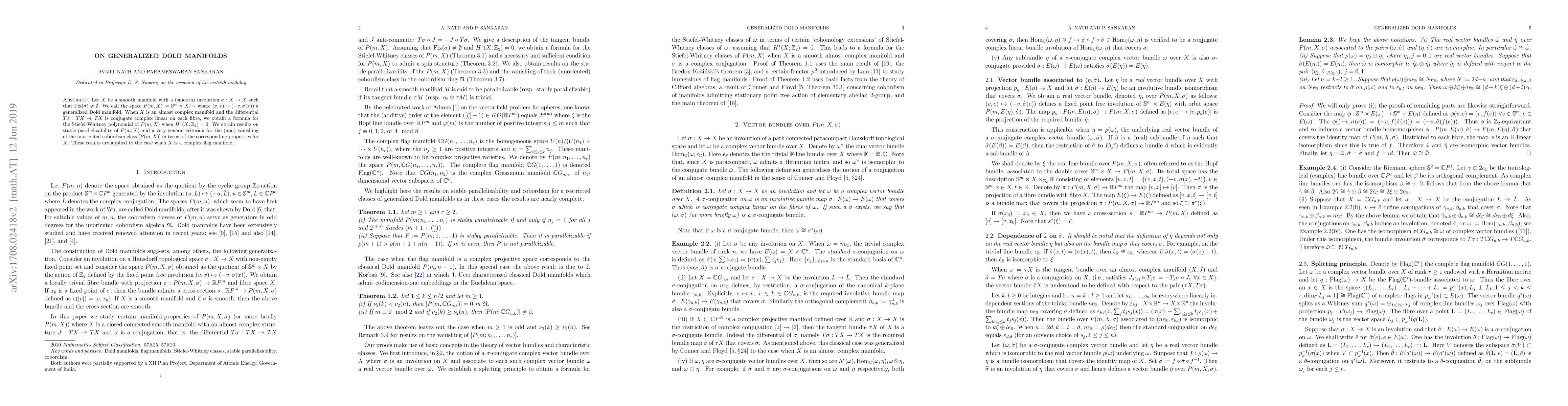 This paper studies generalized Dold manifolds formed from smooth manifolds with involutions and constructs a formula for their Stiefel-Whitney polynomials under certain conditions. It also explores stable parallelizability and cobordism class criteria, applying these findings to complex flag manifolds.