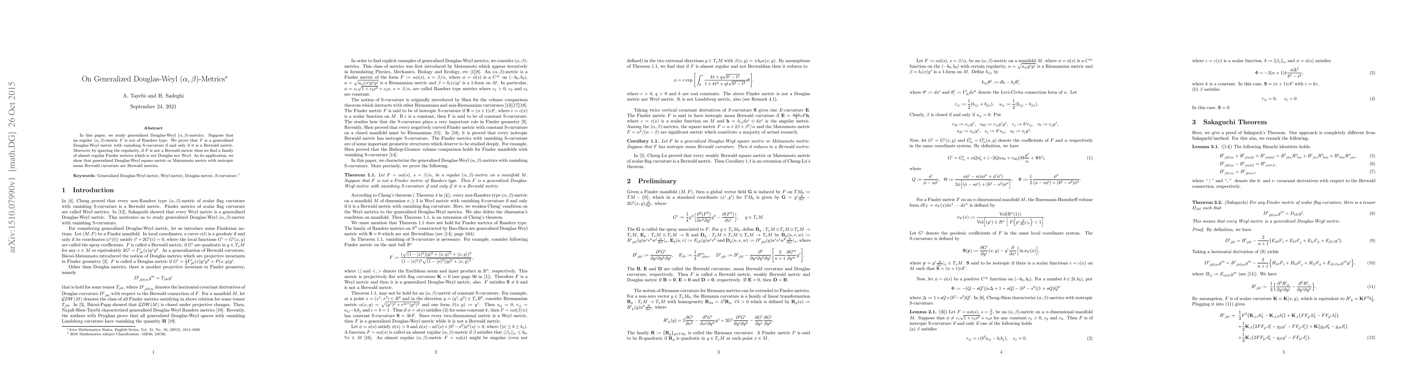 This paper investigates generalized Douglas-Weyl $(\alpha, \beta)$-metrics, proving that a regular $(\alpha, \beta)$-metric $F$ is a generalized Douglas-Weyl metric with vanishing S-curvature if and only if it is a Berwald metric. It also identifies a family of almost regular Finsler metrics that are neither Douglas nor Weyl when $F$ is not a Berwald metric.