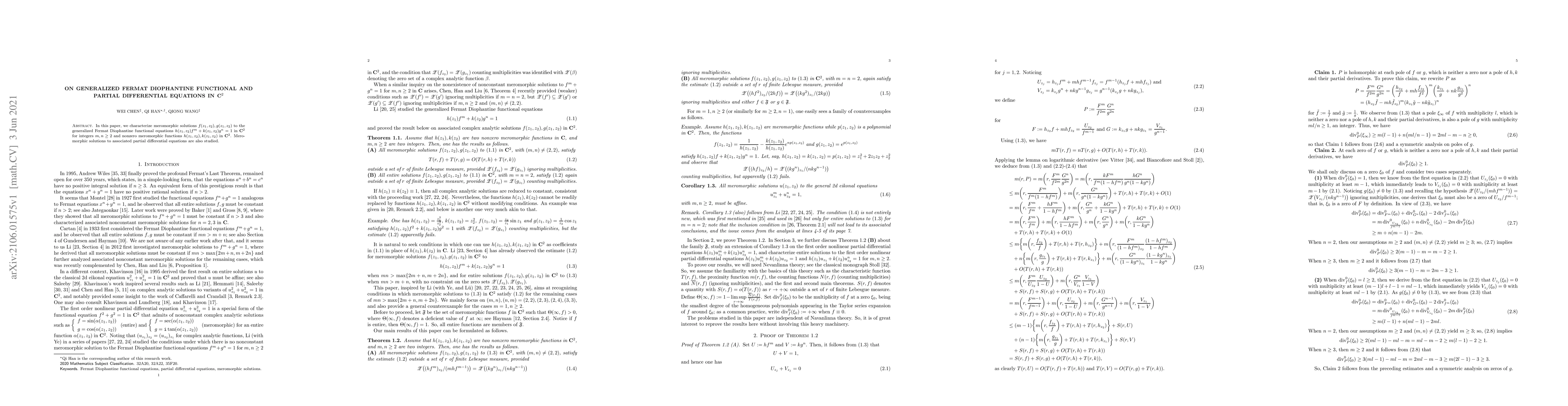 In this paper, we characterize meromorphic solutions $f(z_1,z_2),g(z_1,z_2)$ to the generalized Fermat Diophantine functional equations $h(z_1,z_2)f^m+k(z_1,z_2)g^n=1$ in $\mathbf{C}^2$ for integers $m,n\geq2$ and nonzero meromorphic functions $h(z_1,z_2),k(z_1,z_2)$ in $\mathbf{C}^2$. Meromorphic solutions to associated partial differential equations are also studied.