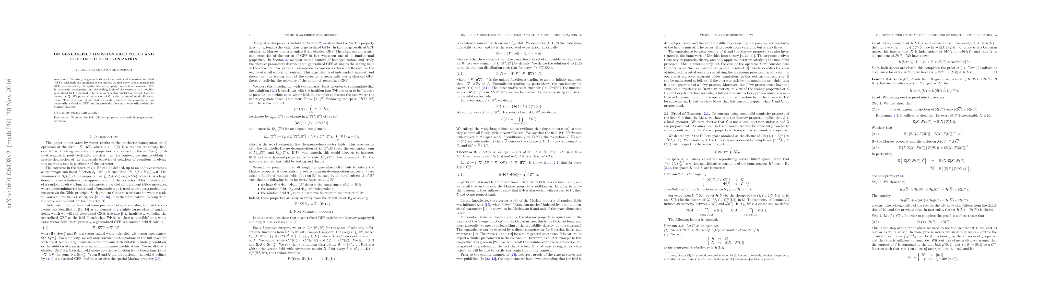 We study a generalization of the notion of Gaussian free field (GFF). Although the extension seems minor, we first show that a generalized GFF does not satisfy the spatial Markov property, unless it is a classical GFF. In stochastic homogenization, the scaling limit of the corrector is a possibly generalized GFF described in terms of an "effective fluctuation tensor" that we denote by $\mathsf{Q}$. We prove an expansion of $\mathsf{Q}$ in the regime of small ellipticity ratio. This expansion shows that the scaling limit of the corrector is not necessarily a classical GFF, and in particular does not necessarily satisfy the Markov property.