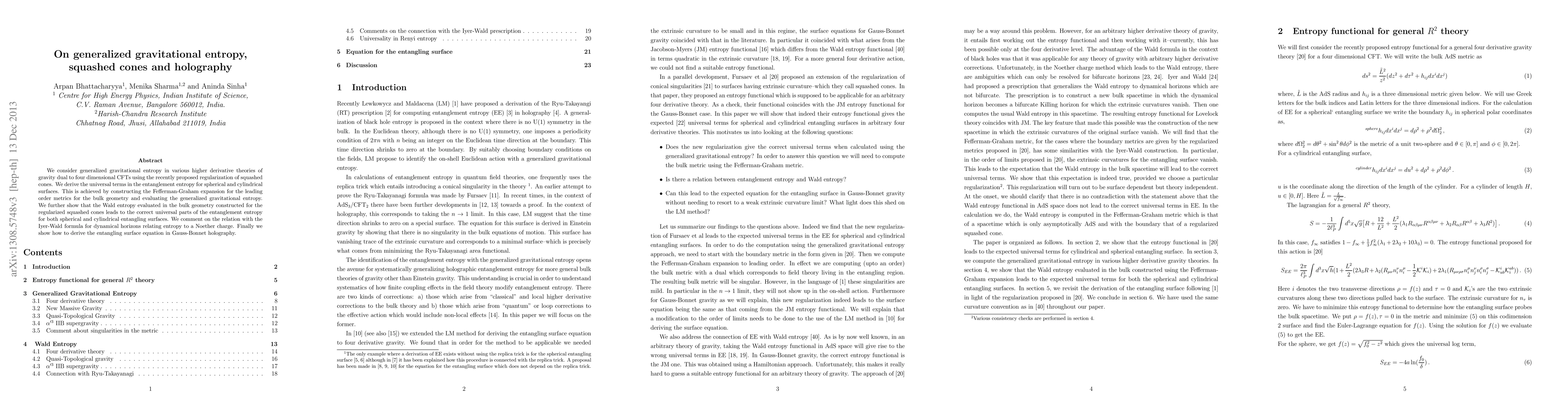 We consider generalized gravitational entropy in various higher derivative theories of gravity dual to four dimensional CFTs using the recently proposed regularization of squashed cones. We derive the universal terms in the entanglement entropy for spherical and cylindrical surfaces. This is achieved by constructing the Fefferman-Graham expansion for the leading order metrics for the bulk geometry and evaluating the generalized gravitational entropy. We further show that the Wald entropy evaluated in the bulk geometry constructed for the regularized squashed cones leads to the correct universal parts of the entanglement entropy for both spherical and cylindrical entangling surfaces. We comment on the relation with the Iyer-Wald formula for dynamical horizons relating entropy to a Noether charge. Finally we show how to derive the entangling surface equation in Gauss-Bonnet holography.