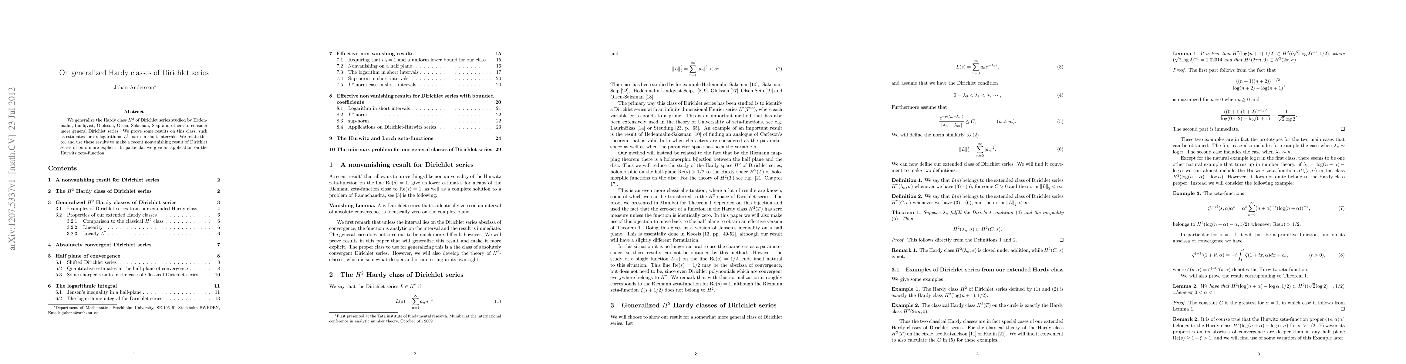 We generalize the Hardy class H^2 of Dirichlet series studied by Hedenmalm, Lindqvist, Olofsson, Olsen, Saksman, Seip and others to consider more general Dirichlet series. We prove some results on this class, such as estimates for its logarithmic L^1-norm in short intervals. We relate this to, and use these results to make a recent nonvanishing result of Dirichlet series of ours more explicit. In particular we give an application on the Hurwitz zeta-function.