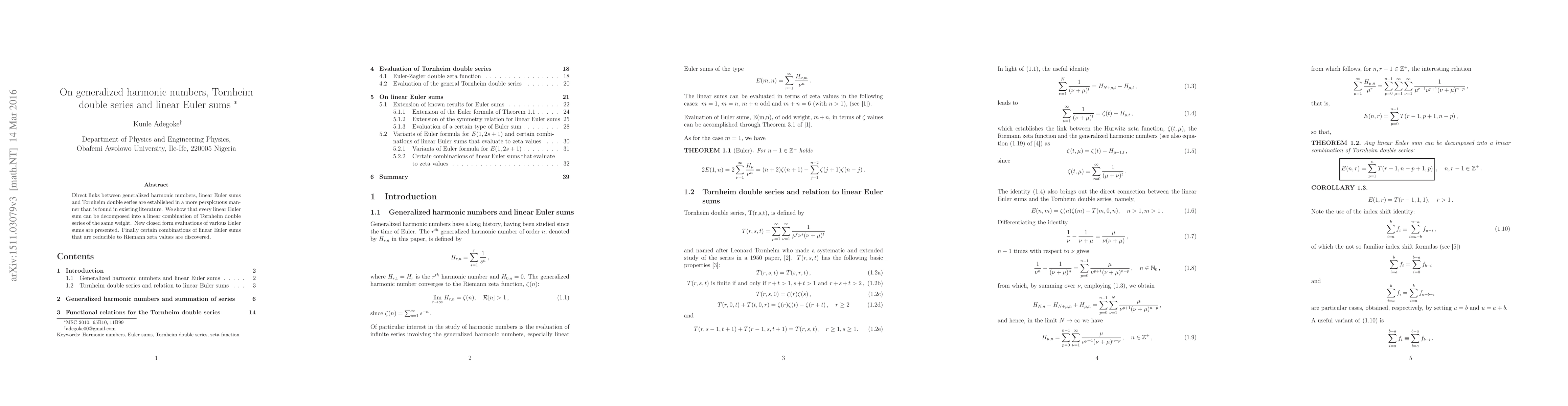 This paper establishes clear connections between generalized harmonic numbers, linear Euler sums, and Tornheim double series, showing that each Euler sum can be expressed as a linear combination of corresponding Tornheim double series. It also provides new closed form evaluations for various Euler sums and identifies combinations reducible to Riemann zeta values.