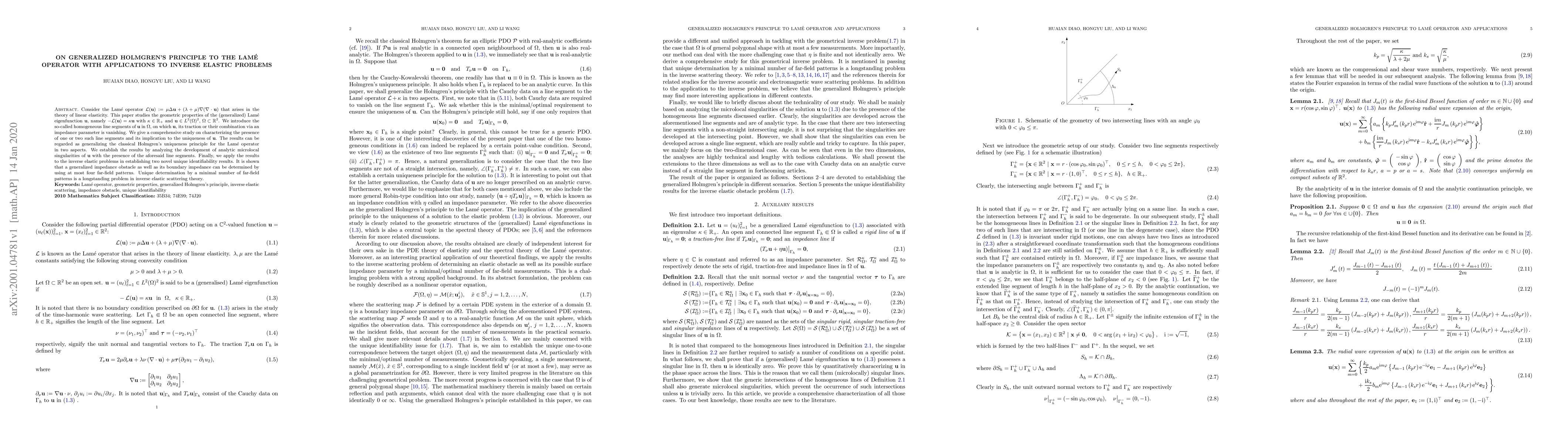 Consider the Lam\'e operator $\mathcal{L}(\mathbf{ u} ) :=\mu \Delta \mathbf{u}+(\lambda+\mu) \nabla(\nabla \cdot \mathbf{ u} )$ that arises in the theory of linear elasticity. This paper studies the geometric properties of the (generalized) Lam\'e eigenfunction $\mathbf{u}$, namely $-\mathcal{L}(\mathbf{ u} )=\kappa \mathbf{ u}$ with $\kappa\in\mathbb{R}_+$ and $\mathbf{ u}\in L^2(\Omega)^2$, $\Omega\subset\mathbb{R}^2$. We introduce the so-called homogeneous line segments of $\mathbf{u}$ in $\Omega$, on which $\mathbf{u}$, its traction or their combination via an impedance parameter is vanishing. We give a comprehensive study on characterizing the presence of one or two such line segments and its implication to the uniqueness of $\mathbf{u}$. The results can be regarded as generalizing the classical Holmgren's uniqueness principle for the Lam\'e operator in two aspects. We establish the results by analyzing the development of analytic microlocal singularities of $\mathbf{u}$ with the presence of the aforesaid line segments. Finally, we apply the results to the inverse elastic problems in establishing two novel unique identifiability results. It is shown that a generalized impedance obstacle as well as its boundary impedance can be determined by using at most four far-field patterns. Unique determination by a minimal number of far-field patterns is a longstanding problem in inverse elastic scattering theory.