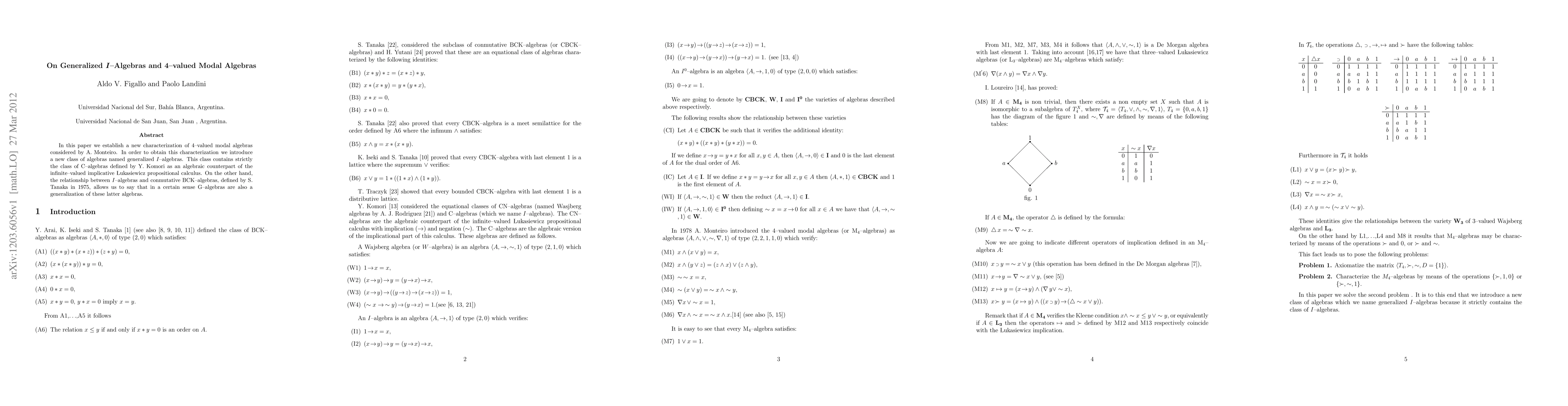 In this paper we establish a new characterization of 4-valued modal algebras considered by A. Monteiro. In order to obtain this characterization we introduce a new class of algebras named generalized I-algebras. This class contains strictly the class of C-algebras defined by Y. Komori as an algebraic counterpart of the infinite-valued implicative Lukasiewicz propositional calculus. On the other hand, the relationship between I-algebras and conmutative BCK-algebras, defined by S. Tanaka in 1975, allows us to say that in a certain sense G-algebras are also a generalization of these latter algebras