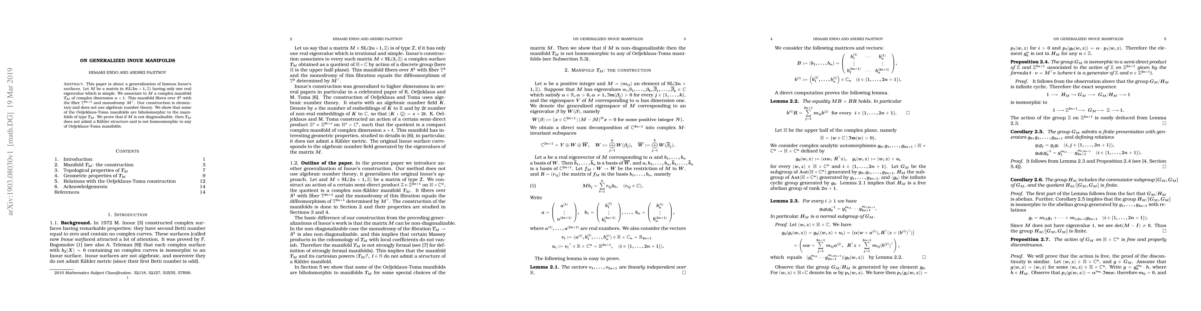 This paper is about a generalization of famous Inoue's surfaces. Let $M$ be a matrix in $SL(2n+1,\mathbb{Z})$ having only one real eigenvalue which is simple. We associate to $M$ a complex manifold $T_M$ of complex dimension $n+1$. This manifold fibers over $S^1$ with the fiber $\mathbb{T}^{2n+1}$ and monodromy $M^\top$. Our construction is elementary and does not use algebraic number theory. We show that some of the Oeljeklaus-Toma manifolds are biholomorphic to the manifolds of type $T_M$. We prove that if $M$ is not diagonalizable, then $T_M$ does not admit a K\"ahler structure and is not homeomorphic to any of Oeljeklaus-Toma manifolds.