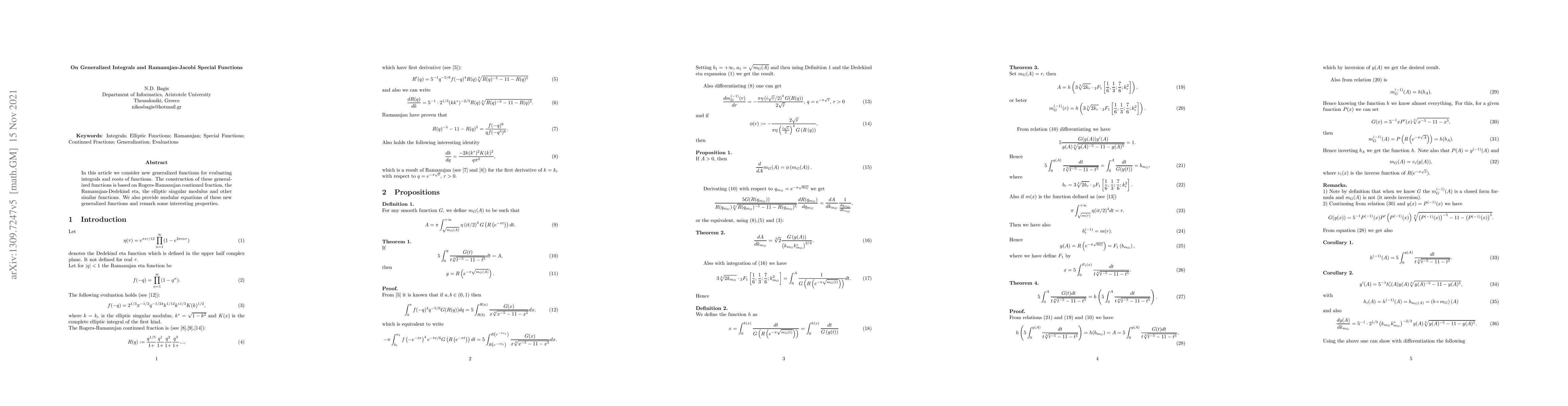 In this article we consider new generalized functions for evaluating integrals and roots of functions. The construction of these generalized functions is based on Rogers-Ramanujan continued fraction, the Ramanujan-Dedekind eta, the elliptic singular modulus and other similar functions. We also provide modular equations of these new generalized functions and remark some interesting properties.