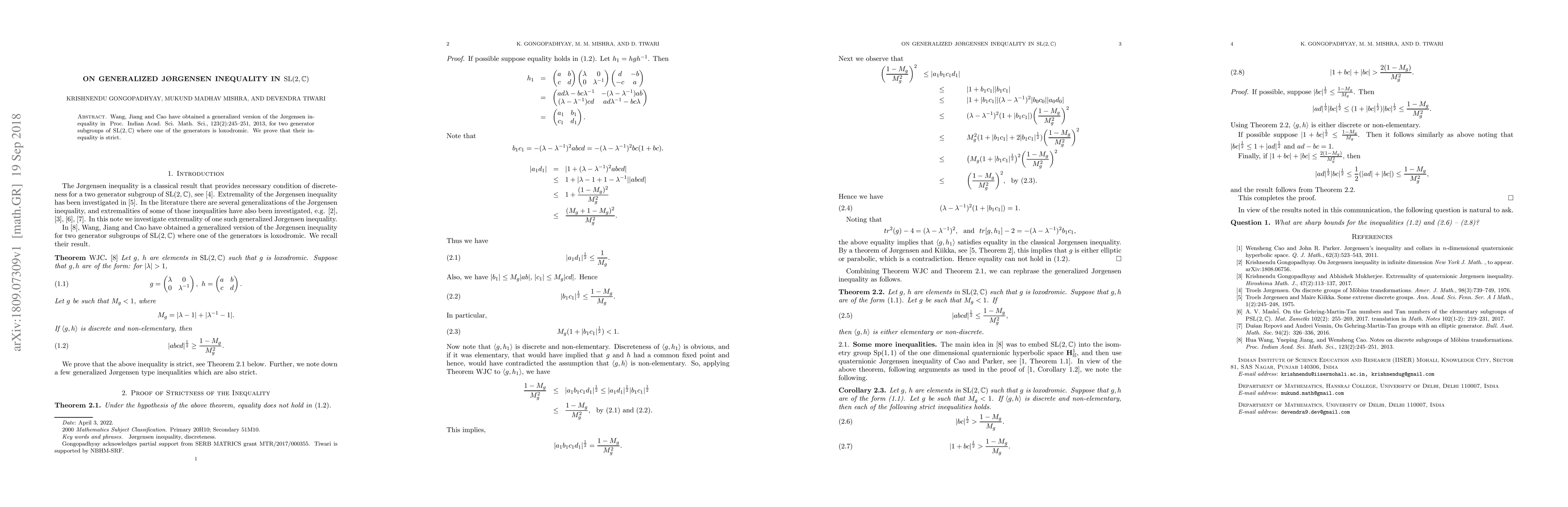 Wang, Jiang and Cao have obtained a generalized version of the J\o{}rgensen inequality in Proc. Indian Acad. Sci. Math. Sci., 123(2):245--251, 2013, for two generator subgroups of ${\rm SL}(2, \mathbb C)$ where one of the generators is loxodromic. We prove that their inequality is strict.