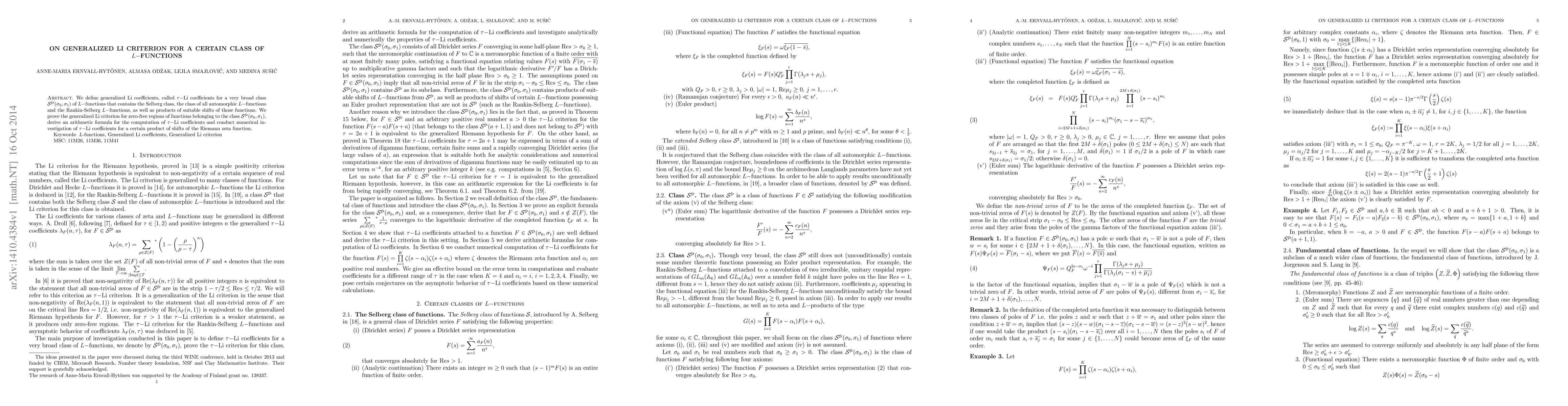 This paper introduces generalized Li coefficients, termed $\tau-$Li coefficients, for a broad class of $L$-functions, including the Selberg and Rankin-Selberg classes. It establishes a generalized Li criterion for zero-free regions within this class and provides an arithmetic formula for computing these coefficients, alongside numerical analysis for a product of shifts of the Riemann zeta function.