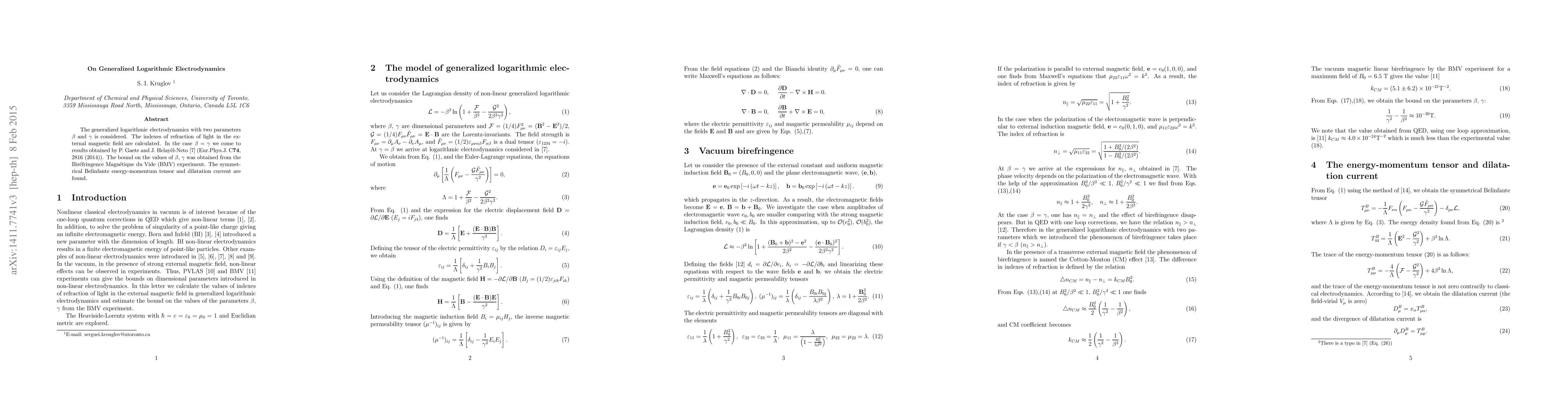 The research considers generalized logarithmic electrodynamics with two parameters, β and γ, deriving equations of motion, electric and magnetic fields, permittivity, and permeability tensors, and examining vacuum birefringence in the presence of an external magnetic field.