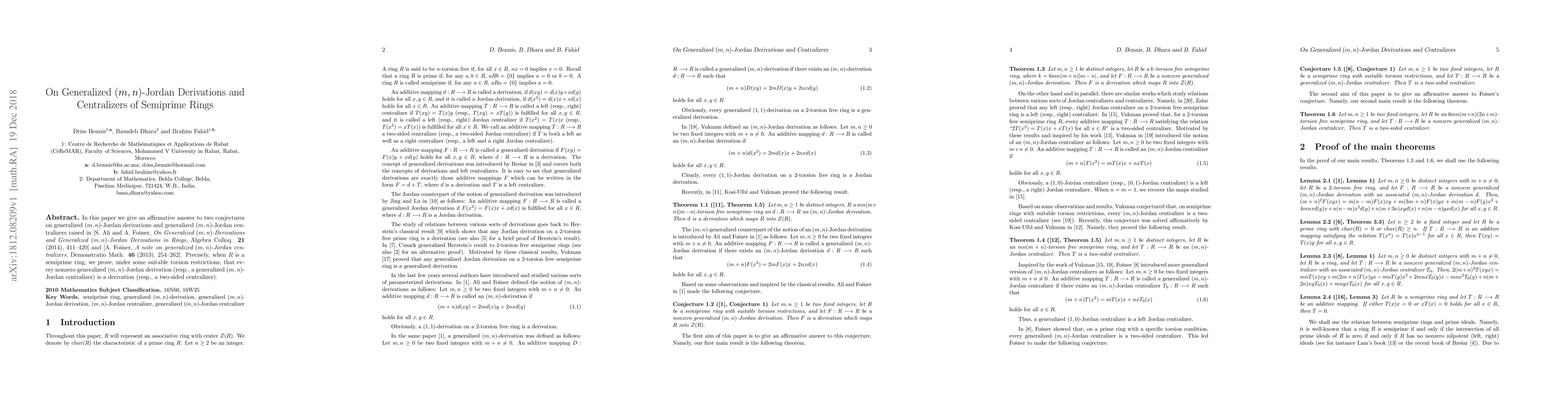 This paper confirms two conjectures regarding generalized $(m,n)$-Jordan derivations and centralizers in semiprime rings, proving that under certain conditions, such derivations and centralizers are standard derivations and two-sided centralizers, respectively.