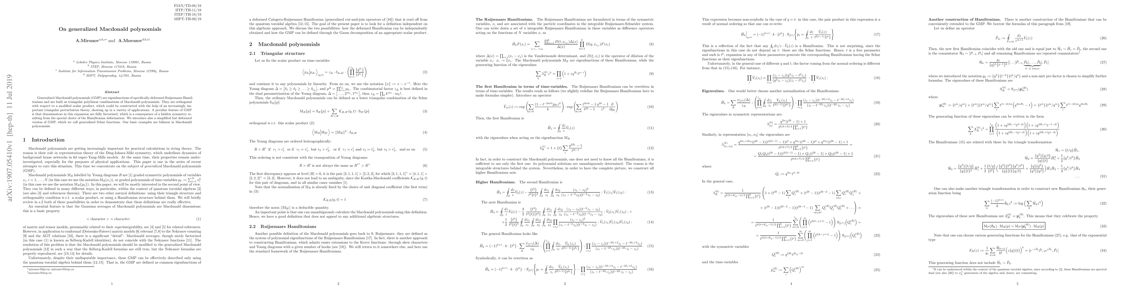Generalized Macdonald polynomials (GMP) are eigenfunctions of specifically-deformed Ruijsenaars Hamiltonians and are built as triangular polylinear combinations of Macdonald polynomials. They are orthogonal with respect to a modified scalar product, which could be constructed with the help of an increasingly important triangular perturbation theory, showing up in a variety of applications. A peculiar feature of GMP is that denominators in this expansion are fully factorized, which is a consequence of a hidden symmetry resulting from the special choice of the Hamiltonian deformation. We introduce also a simplified but deformed version of GMP, which we call generalized Schur functions. Our basic examples are bilinear in Macdonald polynomials.