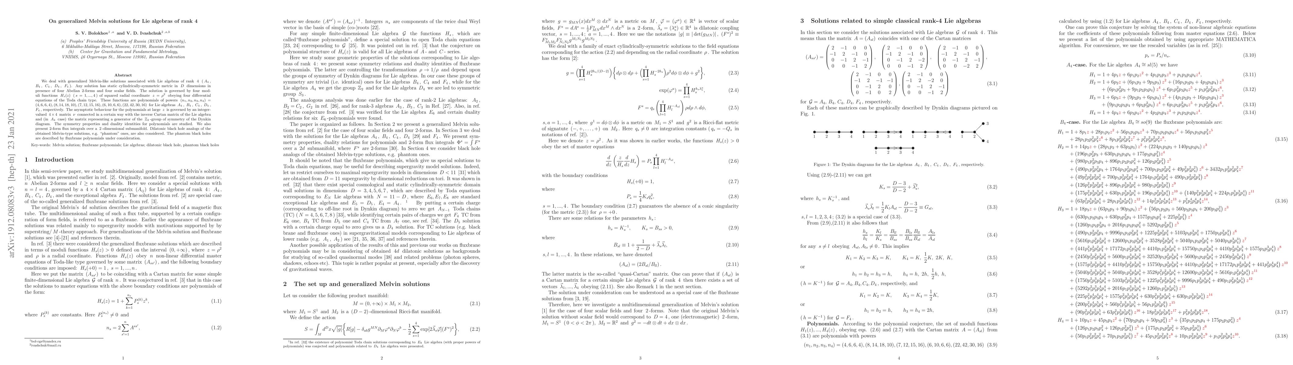We deal with generalized Melvin-like solutions associated with Lie algebras of rank $4$ ($A_4$, $B_4$, $C_4$, $D_4$, $F_4$). Any solution has static cylindrically-symmetric metric in $D$ dimensions in presence of four Abelian 2-forms and four scalar fields. The solution is governed by four moduli functions $H_s(z)$ ($s = 1,...,4$) of squared radial coordinate $z=\rho^2$ obeying four differential equations of the Toda chain type. These functions are polynomials of powers $(n_1,n_2, n_3, n_4) = (4,6,6,4), (8,14,18,10), (7,12,15,16), (6,10,6,6), (22,42,30,16)$ for Lie algebras $A_4$, $B_4$, $C_4$, $D_4$, $F_4$, respectively. The asymptotic behaviour for the polynomials at large $z$ is governed by an integer-valued $4 \times 4$ matrix $\nu$ connected in a certain way with the inverse Cartan matrix of the Lie algebra and (in $A_4$ case) the matrix representing a generator of the $\mathbb{Z}_2$-group of symmetry of the Dynkin diagram. The symmetry properties and duality identities for polynomials are studied. We also present 2-form flux integrals over a $2$-dimensional submanifold. Dilatonic black hole analogs of the obtained Melvin-type solutions, e.g. "fantom" ones, are also considered. The phantom black holes are described by fluxbrane polynomials under consideration.