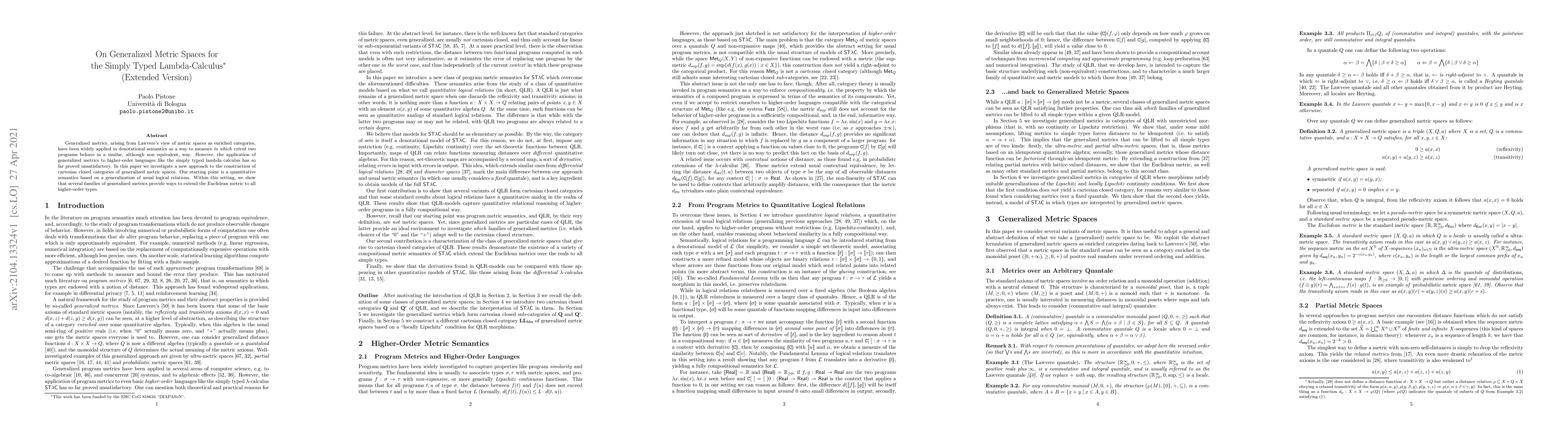 This paper explores the construction of cartesian closed categories of generalized metric spaces for the simply typed lambda calculus, proposing a new quantitative semantics based on generalized logical relations. It demonstrates how several families of generalized metrics can extend the Euclidean metric to all higher-order types.