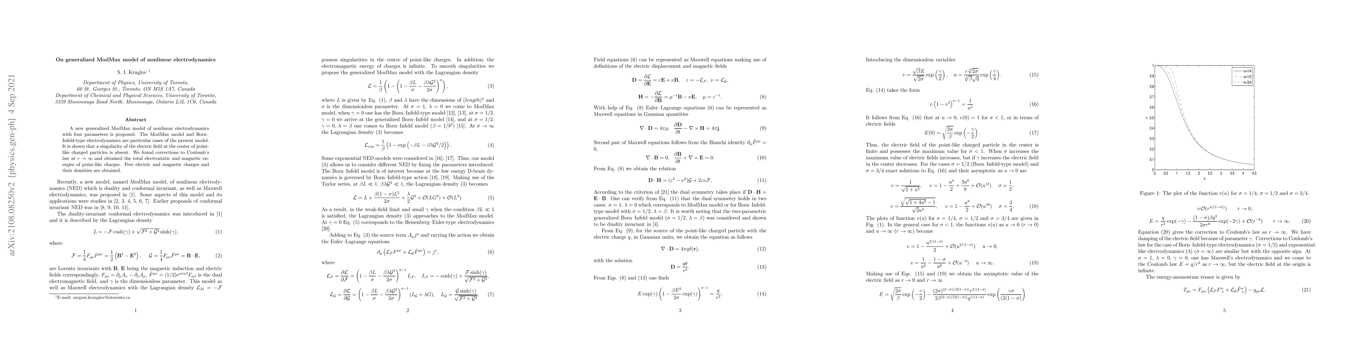 A new generalized ModMax model of nonlinear electrodynamics with four parameters is proposed. The ModMax model and Born--Infeld-type electrodynamics are particular cases of the present model It is shown that a singularity of the electric field at the center of point-like charged particles is absent. We found corrections to Coulomb's law at $r\rightarrow\infty$ and obtain the total electrostatic and magnetic energies of point-like charges. Free electric and magnetic charges and their densities are obtained.