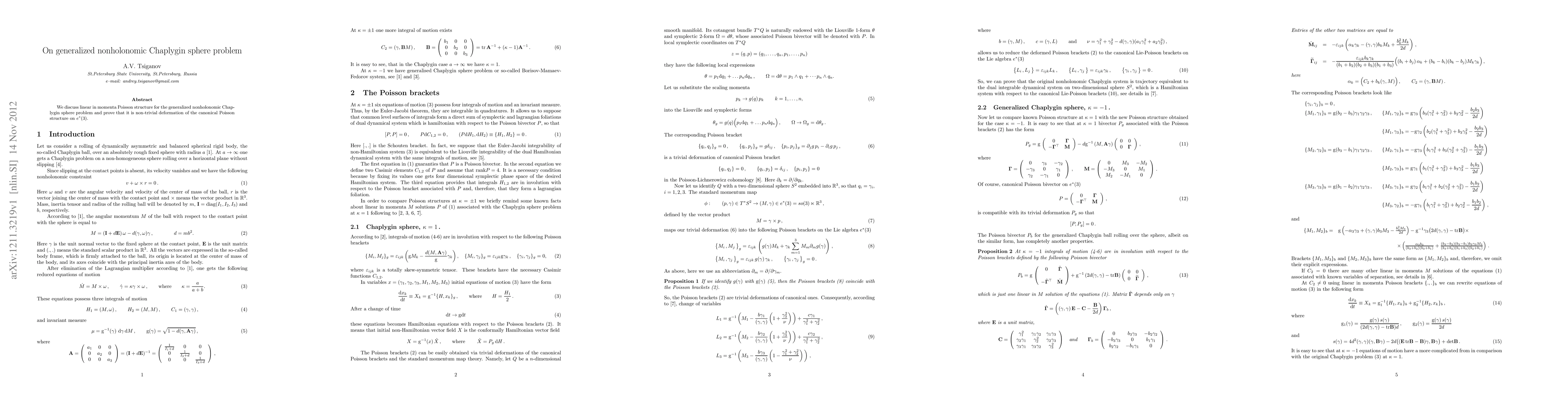 Summary: This paper explores the linear Poisson structure in the generalized nonholonomic Chaplygin sphere problem, proving it to be a non-trivial deformation of the canonical Poisson structure on the dual of the 3-dimensional Euclidean space.