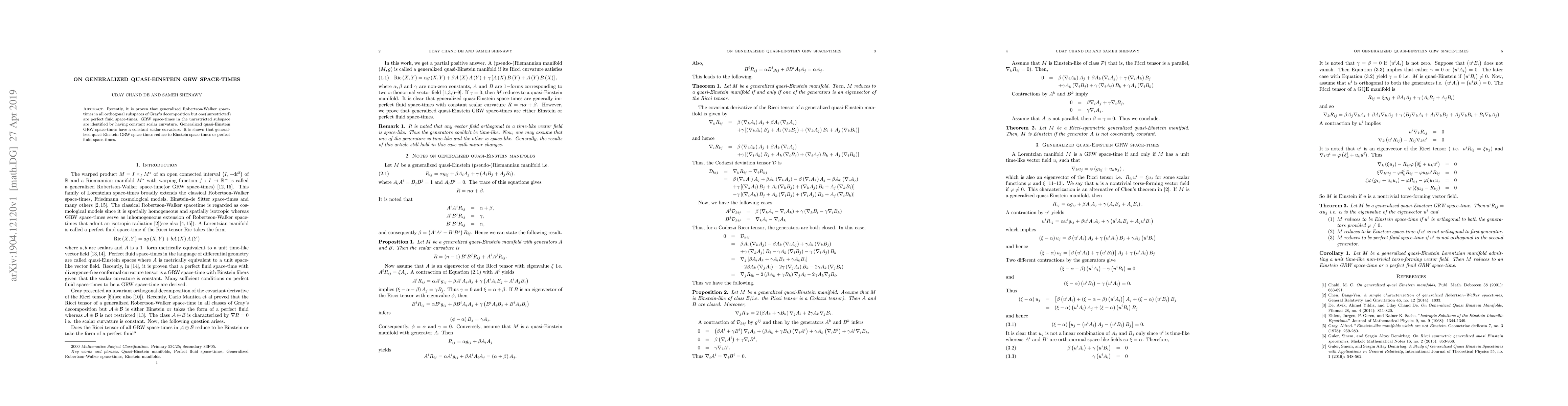 Recently, it is proven that generalized Robertson-Walker space-times in all orthogonal subspaces of Gray's decomposition but one(unrestricted) are perfect fluid space-times. GRW space-times in the unrestricted subspace are identified by having constant scalar curvature. Generalized quasi-Einstein GRW space-times have a constant scalar curvature. It is shown that generalized quasi-Einstein GRW space-times reduce to Einstein space-times or perfect fluid space-times.