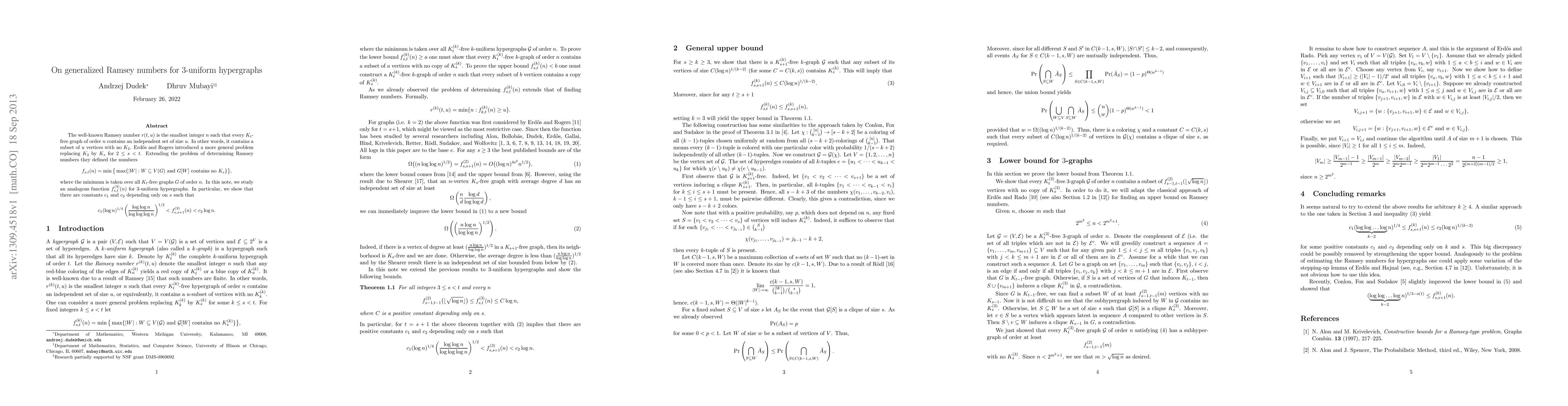 This paper explores generalized Ramsey numbers for 3-uniform hypergraphs, defining a function $f_{s,t}^{(3)}(n)$ analogous to classical Ramsey numbers. It establishes bounds for this function, showing that $f_{s,s+1}^{(3)}(n)$ lies between $c_1(\log n)^{1/4} (\frac{\log\log n}{\log\log\log n})^{1/2}$ and $c_2 \log n$ for certain constants $c_1$ and $c_2$.