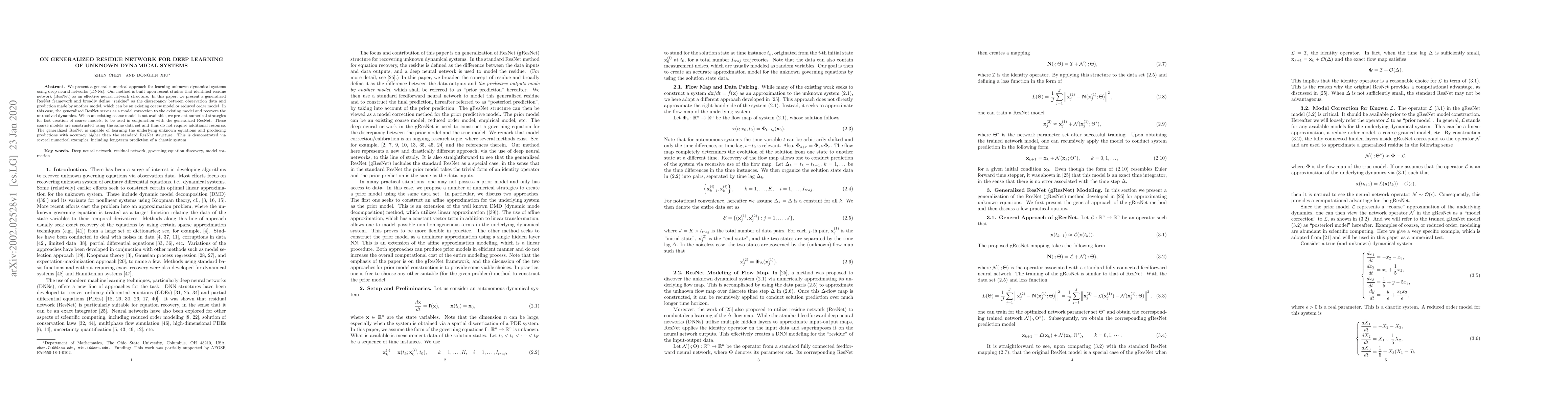 This paper introduces a generalized ResNet framework for deep learning of unknown dynamical systems. It extends ResNet by defining residue as data-prediction discrepancy, using it to correct existing models or create fast coarse models when none exist. The method improves prediction accuracy, as demonstrated through examples including chaotic system predictions.