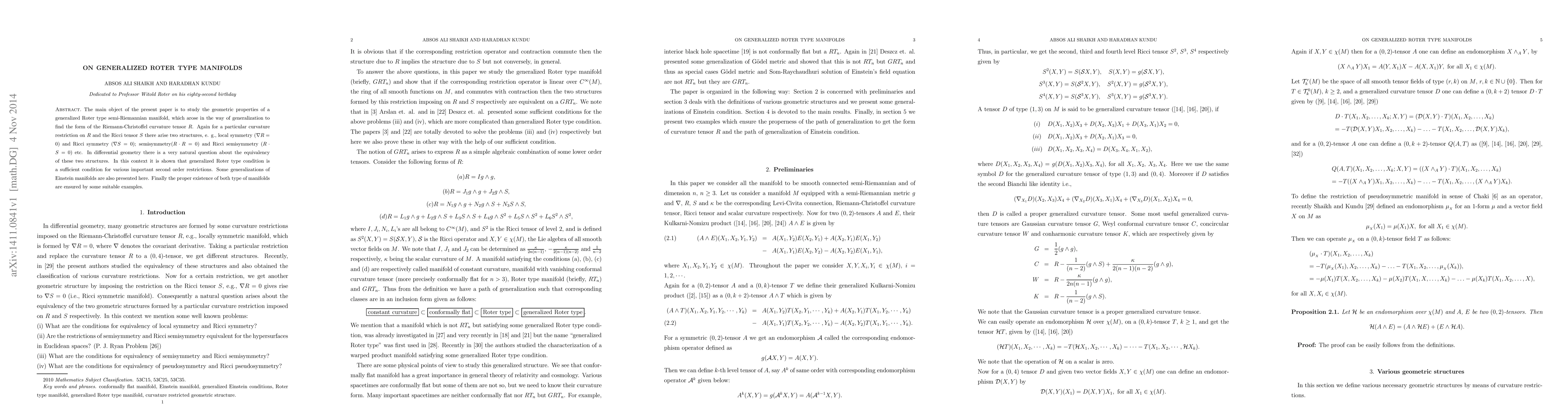 The main object of the present paper is to study the geometric properties of a generalized Roter type semi-Riemannian manifold, which arose in the way of generalization to find the form of the Riemann-Christoffel curvature tensor $R$. Again for a particular curvature restriction on $R$ and the Ricci tensor $S$ there arise two structures, e. g., local symmetry ($\nabla R = 0$) and Ricci symmetry ($\nabla S = 0$); semisymmetry($R\cdot R =0$) and Ricci semisymmetry ($R\cdot S =0$) etc. In differential geometry there is a very natural question about the equivalency of these two structures. In this context it is shown that generalized Roter type condition is a sufficient condition for various important second order restrictions. Some generalizations of Einstein manifolds are also presented here. Finally the proper existence of both type of manifolds are ensured by some suitable examples.