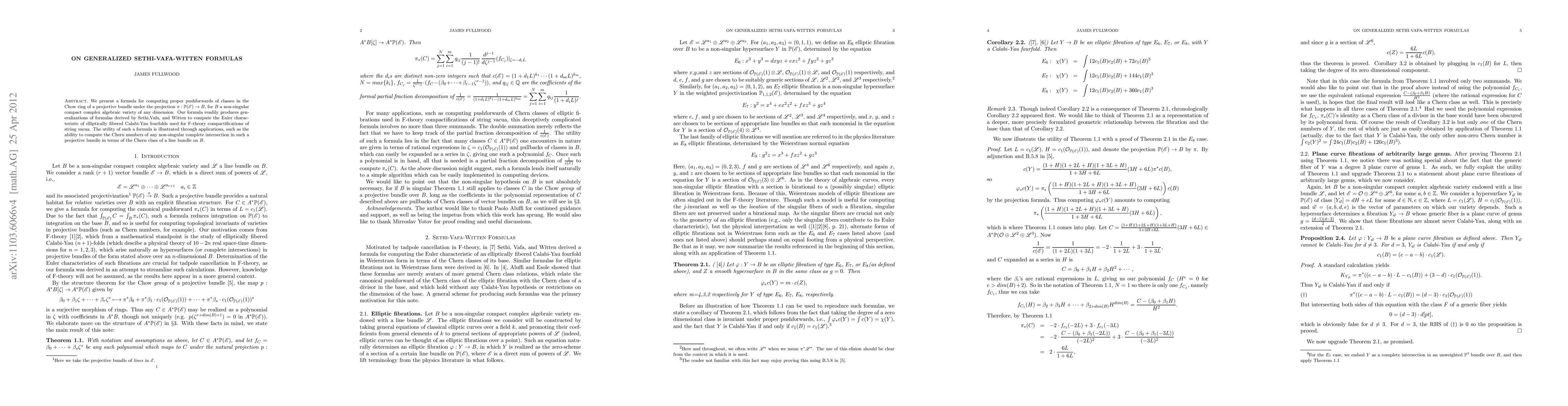 We present a formula for computing proper pushforwards of classes in the Chow ring of a projective bundle under the projection $\pi:\Pbb(\Escr)\rightarrow B$, for $B$ a non-singular compact complex algebraic variety of any dimension. Our formula readily produces generalizations of formulas derived by Sethi,Vafa, and Witten to compute the Euler characteristic of elliptically fibered Calabi-Yau fourfolds used for F-theory compactifications of string vacua. The utility of such a formula is illustrated through applications, such as the ability to compute the Chern numbers of any non-singular complete intersection in such a projective bundle in terms of the Chern class of a line bundle on $B$.