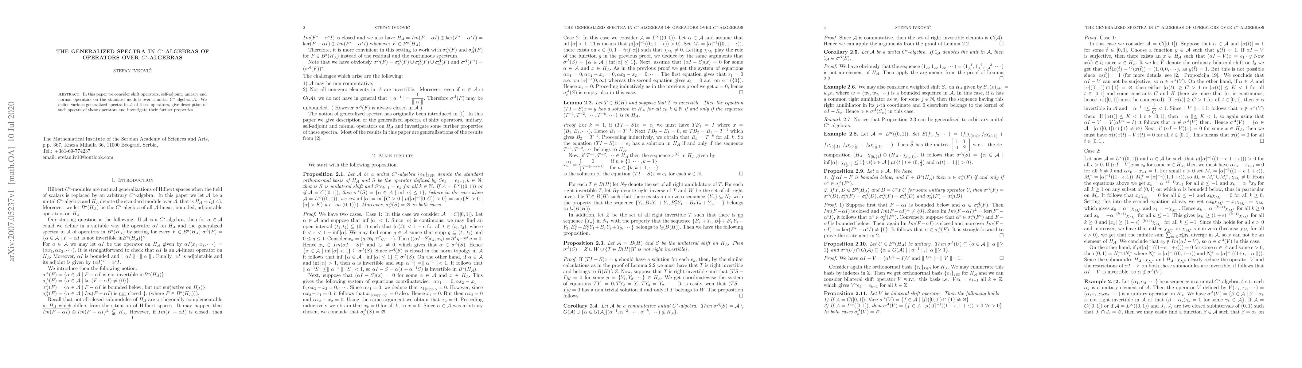 In this paper we consider shift operators, self-adjoint, unitary and normal operators on the standard module over a unital C*-algebra A. We define various generalized spectra in A of these operators, give description of such spectra of these operators and investigate their further properties.