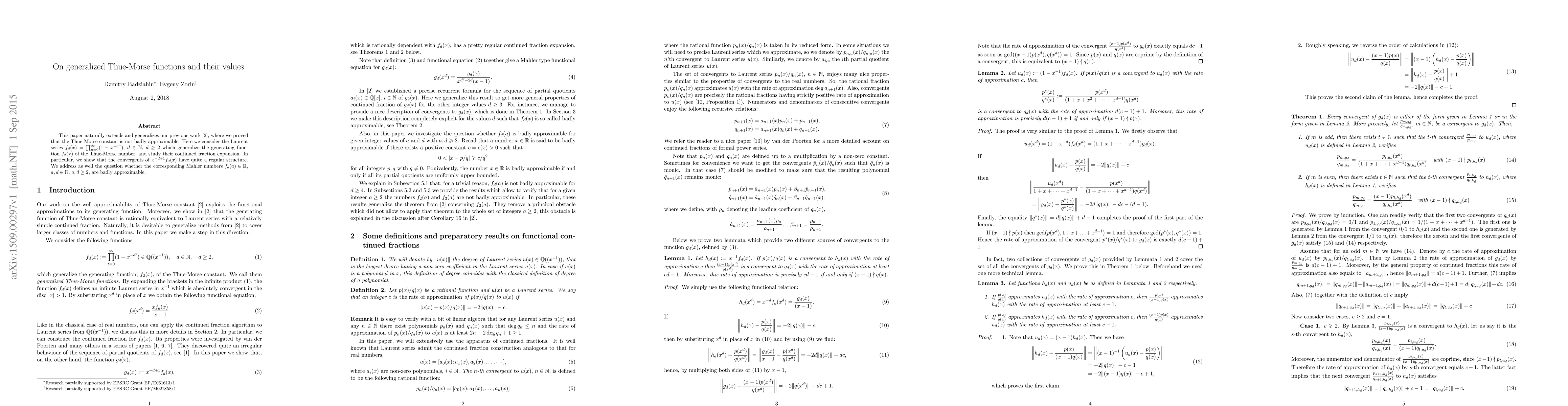 This paper naturally extends and generalizes our previous work "Thue-Morse constant is not badly approximable", arXiv:1407.3182 [math.NT]. Here we consider the Laurent series $f_d(x) = \prod_{n=0}^\infty (1 - x^{-d^n})$, $d\in\mathbb{N}$, $d\geq 2$ which generalize the generating function $f_2(x)$ of the Thue-Morse number, and study their continued fraction expansion. In particular, we show that the convergents of $x^{-d+1}f_d(x)$ have quite a regular structure. We address as well the question whether the corresponding Mahler numbers $f_d(a)\in\mathbb{R}$, $a,d\in\mathbb{N}$, $a,d\geq 2$, are badly approximable.
