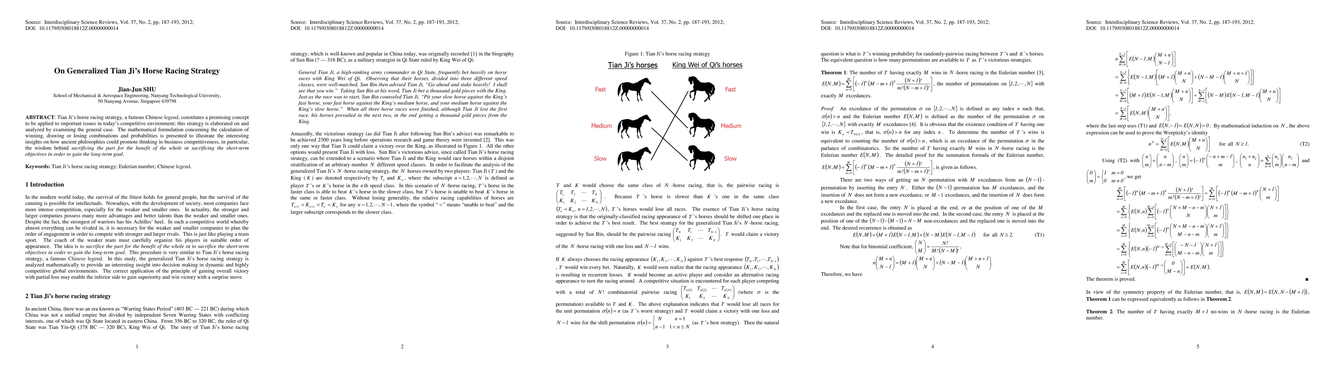 Tian Ji's horse racing strategy, a famous Chinese legend, constitutes a promising concept to be applied to important issues in today's competitive environment; this strategy is elaborated on and analyzed by examining the general case. The mathematical formulation concerning the calculation of winning, drawing or losing combinations and probabilities is presented to illustrate the interesting insights on how ancient philosophies could promote thinking in business competitiveness, in particular, the wisdom behind sacrificing the part for the benefit of the whole or sacrificing the short-term objectives in order to gain the long-term goal.